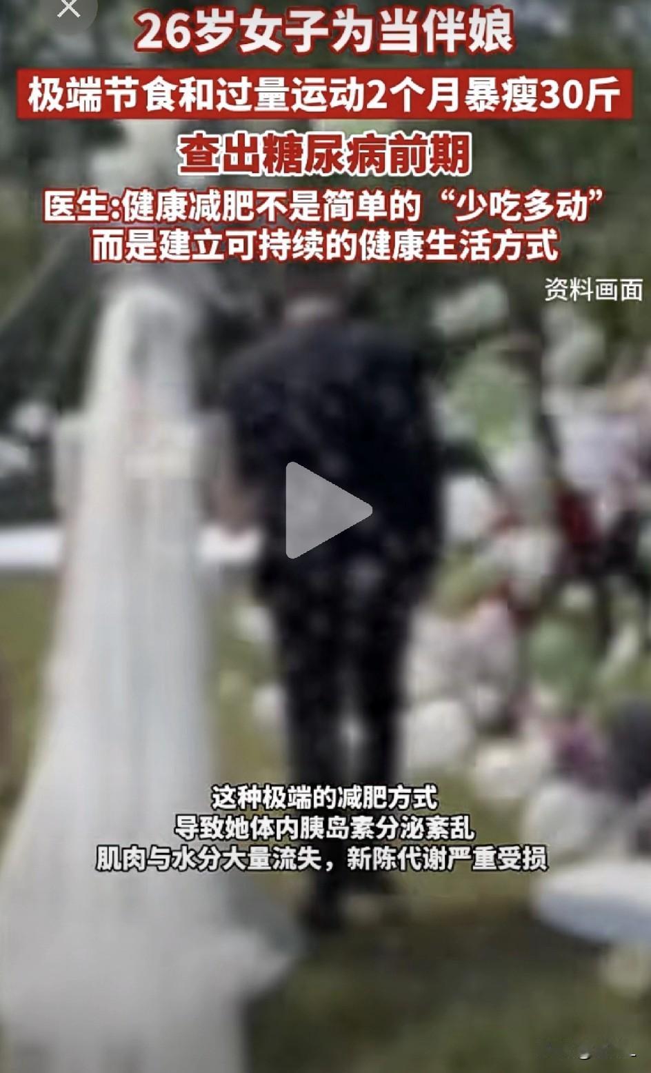为当伴娘狂甩30斤,26岁姑娘差点把自己“减”成糖尿病人! 姐妹们,为了在闺蜜婚礼上当最靓的伴娘,你能拼到什么程度? 杭州26岁的小雨(化名)给出了一个吓死人的答案——两个月暴瘦30斤,结果婚礼还没参加,先给自己“挣”了个糖尿病前期的诊断书! “要么瘦要么死”?她真差点选错了! 身高1米6、体重130斤的小雨,接到闺蜜伴娘邀请时,看着衣柜里的裙子发了愁。一咬牙,她开启了“地狱减肥模式”: 吃? 每天就几片菜叶子加鸡胸肉,米饭面条这些碳水?那是“敌人”!彻底断绝! 动? 每天雷打不动跑10公里以上,不跑到虚脱不罢休。 还真别说,这狠劲儿效果惊人——两个月时间,体重秤上的数字从130斤“唰”地掉到了100斤! 伴娘礼服是能穿上了,可小雨人也快不行了。 就在小雨对着镜子欣赏自己“成果”时,身体开始疯狂拉警报: 💢整天头晕眼花,站都站不稳! 💢心慌气短,像刚跑完马拉松! 💢口渴得不行,水杯不离手! 去医院一查,结果晴天霹雳: 空腹血糖7.8(正常应该<6.1) 糖耐量2小时血糖10.2(正常应该<7.8) 医生看着检查单直摇头:“姑娘,你这是糖尿病前期了!再晚点来,糖尿病可就找上门了!” 医生一句话点醒梦中人:“你减掉的不只是脂肪!” 原来,小雨这种“自杀式减肥”犯了三大忌: 1️⃣肌肉掉得比脂肪还快 过度节食加疯狂有氧,身体最先消耗的不是脂肪,而是宝贵的肌肉!肌肉可是消耗血糖的“主力军”,肌肉没了,血糖自然容易升高。 2️⃣身体被吓出了“应激反应” 每天又饿又累,身体以为遇到“饥荒”了,赶紧分泌皮质醇(压力激素)来保命,而这激素偏偏会拉高血糖。 3️⃣胰岛功能被搞乱了 长期断碳,胰腺不知道该怎么正常工作了,突然吃点碳水,胰岛素分泌直接“乱套”。 好在发现得早,小雨在营养科医生指导下开始了科学调整: ✅杂粮饭、全麦面包合理吃,蛋白质、蔬菜均衡搭配。 ✅不再疯狂跑步,改为中等强度有氧+力量训练,增肌才是王道。 ✅不再追求“骨感”,健康美才是真的美。 三个月后复查,体重稳定在105斤,血糖指标全部回到了正常范围! 空腹血糖5.6,妥妥的安全区。 小雨现在逢人就说:“以前觉得瘦就是美,现在才知道,健康的身体才是最美的礼服。” 婚礼季又要来了,多少姑娘正在拼命减肥? 转发提醒你关心的她:美很重要,但为此赌上健康,真的不值! 科学减肥,健康生活,才是永远的王道。 素材来源:半岛都市报,侵联删!