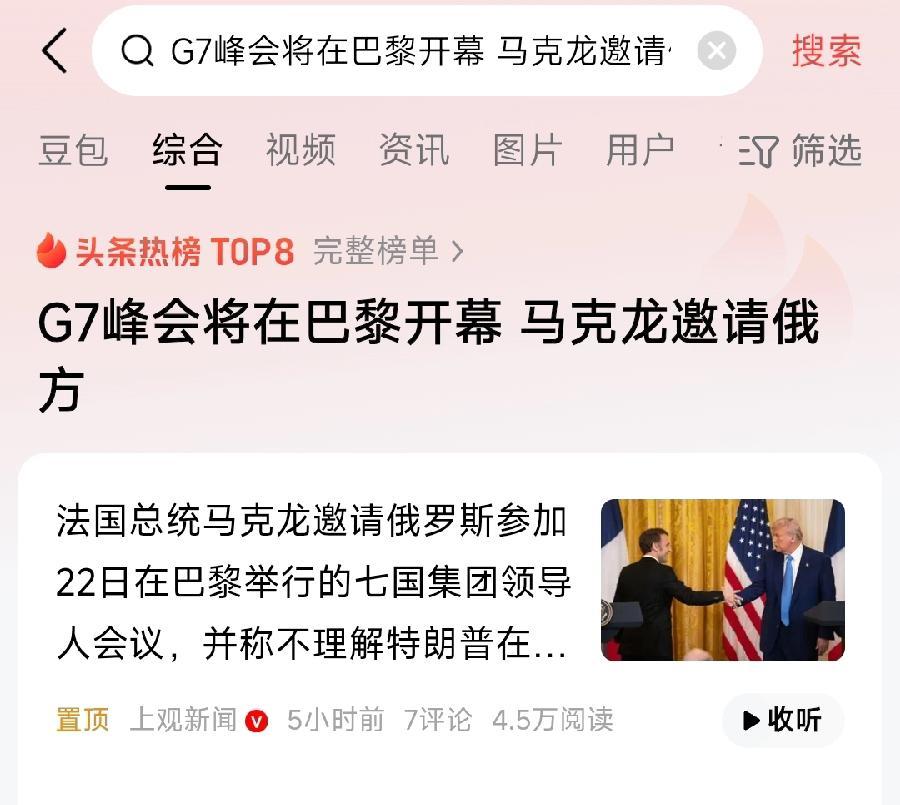 马克龙邀请普京参加G7,普京肯定不会去!一是担心被绑了、逮捕了,有人身安全甚至生命危险!二是太尴尬,自讨没趣!除了特朗普、马克龙,其它五国英德意加日,还有欧盟冯德莱恩、科斯塔,去普京关系还是很僵,根本不会搭理普京,怎么能坐一起开会、吃饭,还有私底下聊天?普京根本受不了!所以法国只是像特朗普一样,变了态度、展示诚意,普京派代表去,比如外交部长拉夫罗夫!
