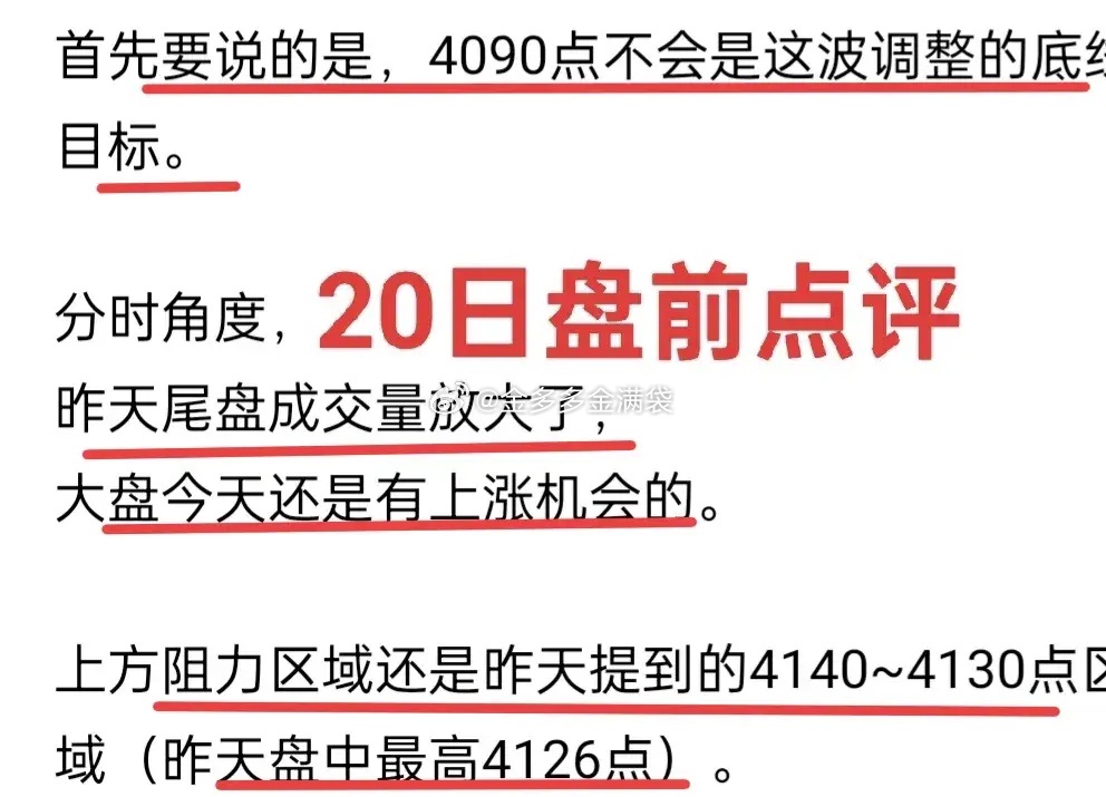 A股:今天主力资金流出超过1000亿,昨天的数据是400多亿。两市放量下跌,局部有恐慌盘涌现。明天可能出现抄底机会。今天沪深两市成交金额为2.77万亿,比昨天放大约700亿。这其中贡献较大的可能是商业航天板块中的一些高标股。在经历令人窒息的连续缩量下跌之后(有些个股是一字跌停板),部分商业航天板块个股今天是放量下跌。显然是有投资者扛不住了,当然,成交量放大,也说明有人进场抄底了。这些个抄底资金是主力自救,还是不明就里见利忘“险”的散户,明天会见分晓。金姐估计是主力点火,吸引散户跟进,明天可能冲高之后,就不会表演了。明天可能会出现抄底机会,但也不是什么底都好抄的。满足什么条件,抄底的价值会大一些呢?1,低开高走低开是前提。低开把今天的下影线吃掉,让投资者以为大盘真“不行”了,没救了。把今天午后抄底的资金再吓出去。2,跌到支撑区域4080~4070点,是渔夫上周末讲过的多头第一道防线。如果大盘低开,跌进4080~4070区域,最好能跌破4070点。这样较大幅度的下跌会惊呆很多投资者,从而达到迫使投资者割肉的目的。如果大盘没有按上述路径走呢?一手拿着钱,一手拿着票,该干嘛干嘛。大盘实现了金姐开盘前的两个预测(图):1,4090点不是本次调整点。——今天盘中最低4080点。2,有反弹,但会受阻于压力区域4130—4140点。——今天最高点4128.93点。看看明天大盘会不会按剧本执行。个人观点,仅供交流,不构成投资建议!理财有风险,投资需谨慎!