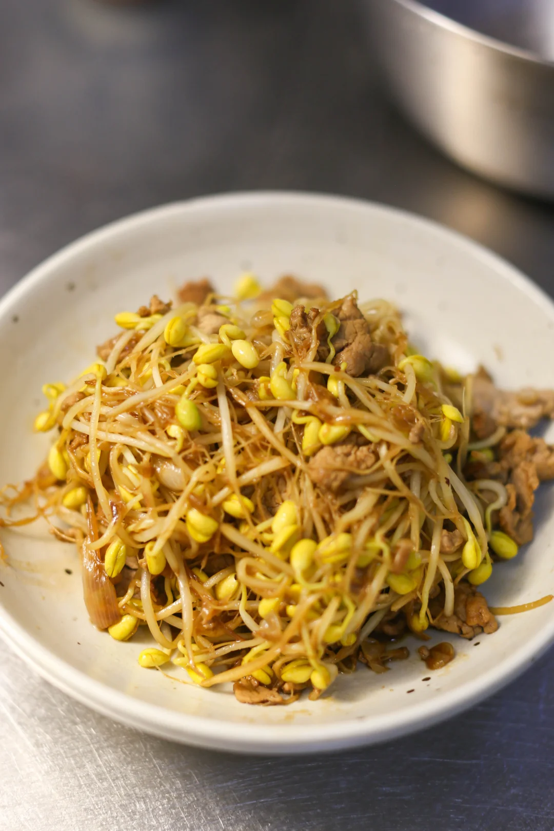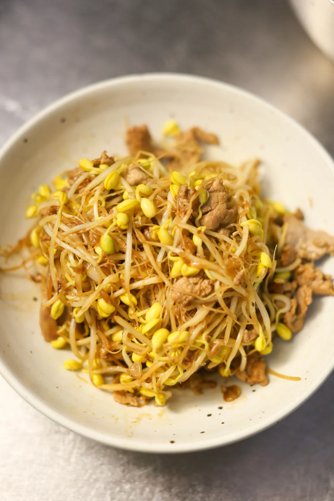 从容器中取出整块豆芽,用清水冲掉脱落的豆皮。