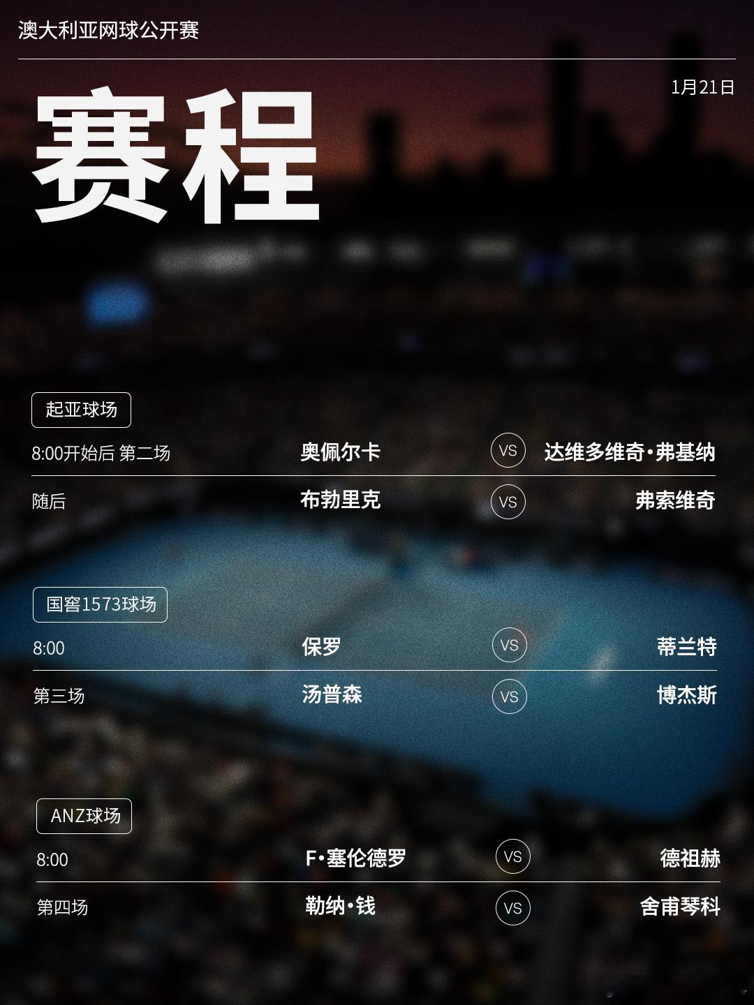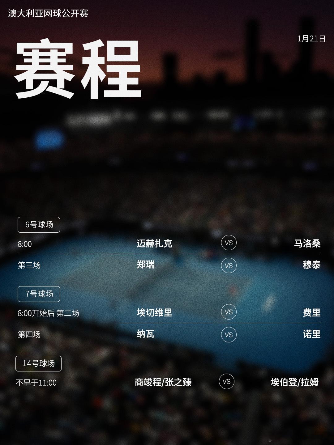澳网2026 1月21日将展开上半区男单二轮的争夺,赛程见图(均为北京时间)📅