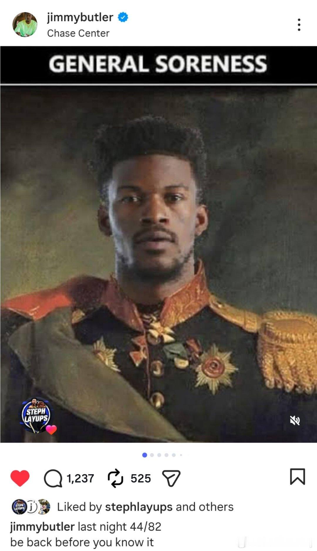 何等强大的心态....这个时候巴特勒还在自嘲玩梗刚刚,巴特勒IG发图文写到:赛季进程44/82,我将很快回归,并配上了“疼痛将军”的图片。General Soreness来自于巴特勒森林狼时期的一个梗,当时他有时会以“全身酸痛”(General Soreness)为由缺阵,由于General也有将军的意思,于是明尼苏达球迷便称其为“酸痛将军”。