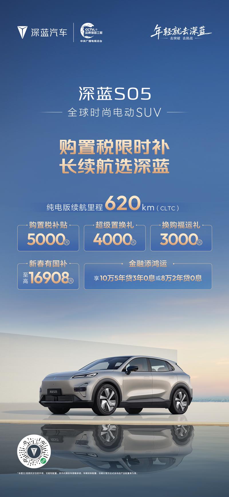 深蓝S05可享受购置税补贴5000元、超级置换礼4000元、换购福运礼3000元、新春有国补至高16908元。同时,还可享受金融添鸿运,享10万5年贷3年0息或8万2年贷0息。