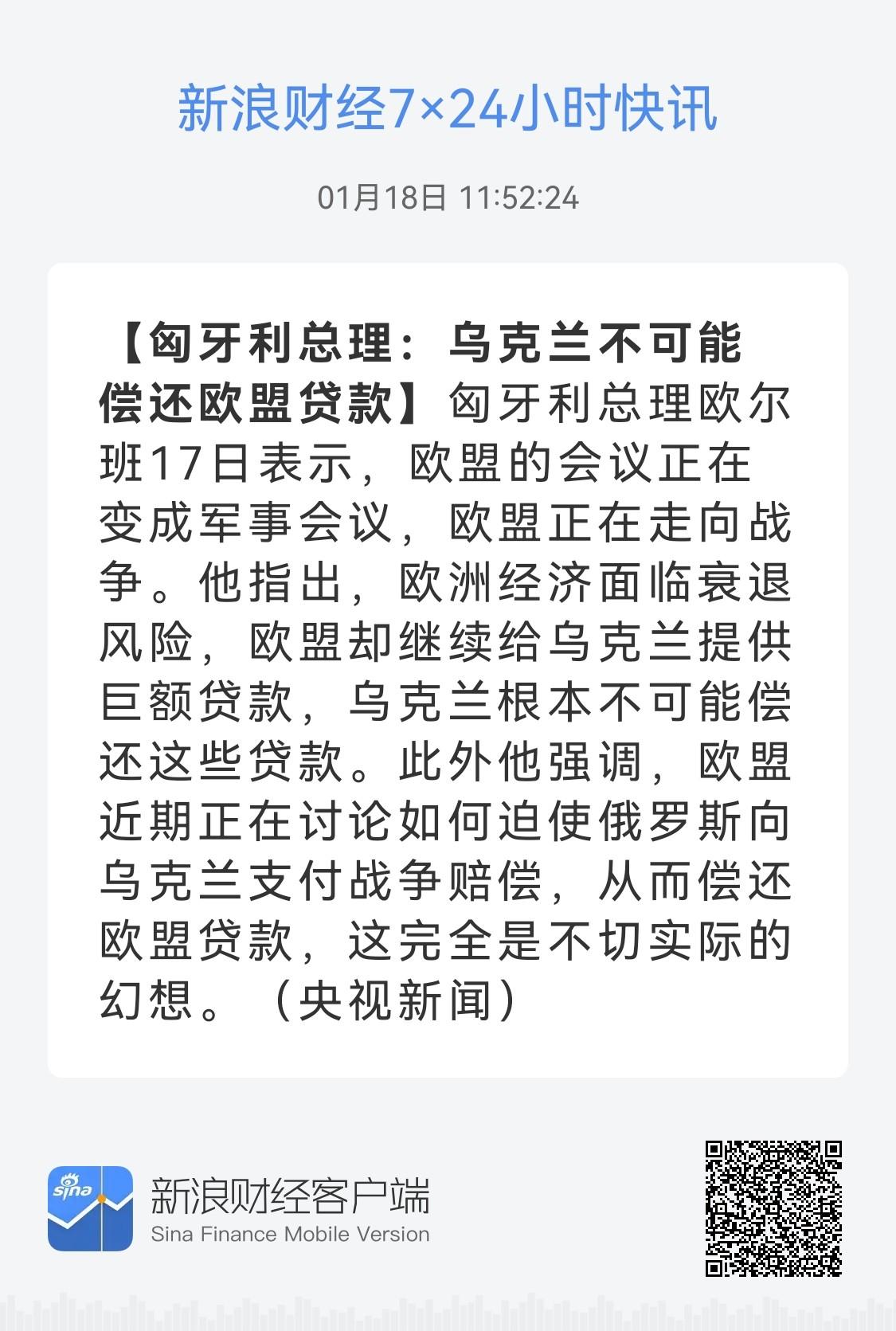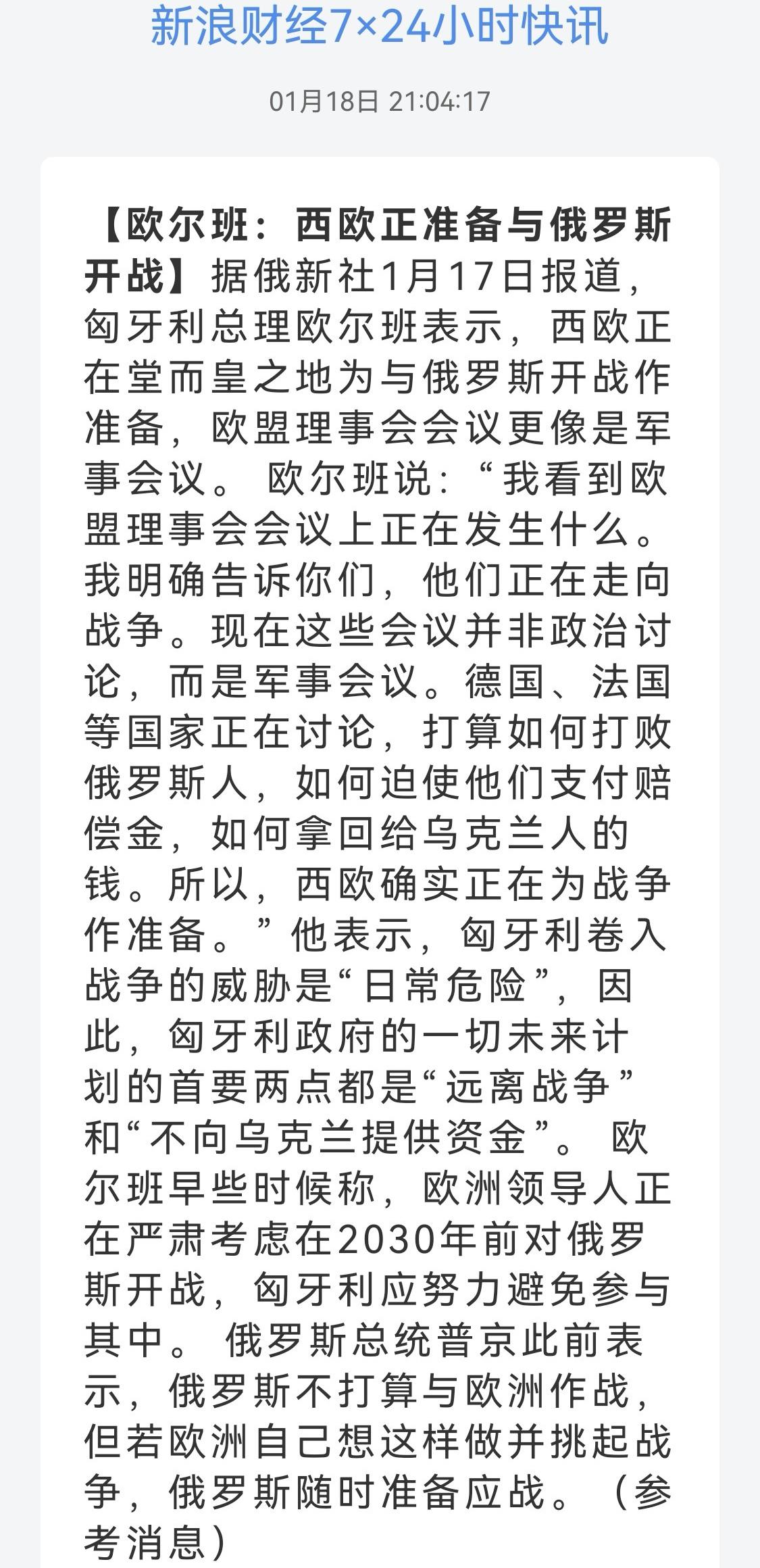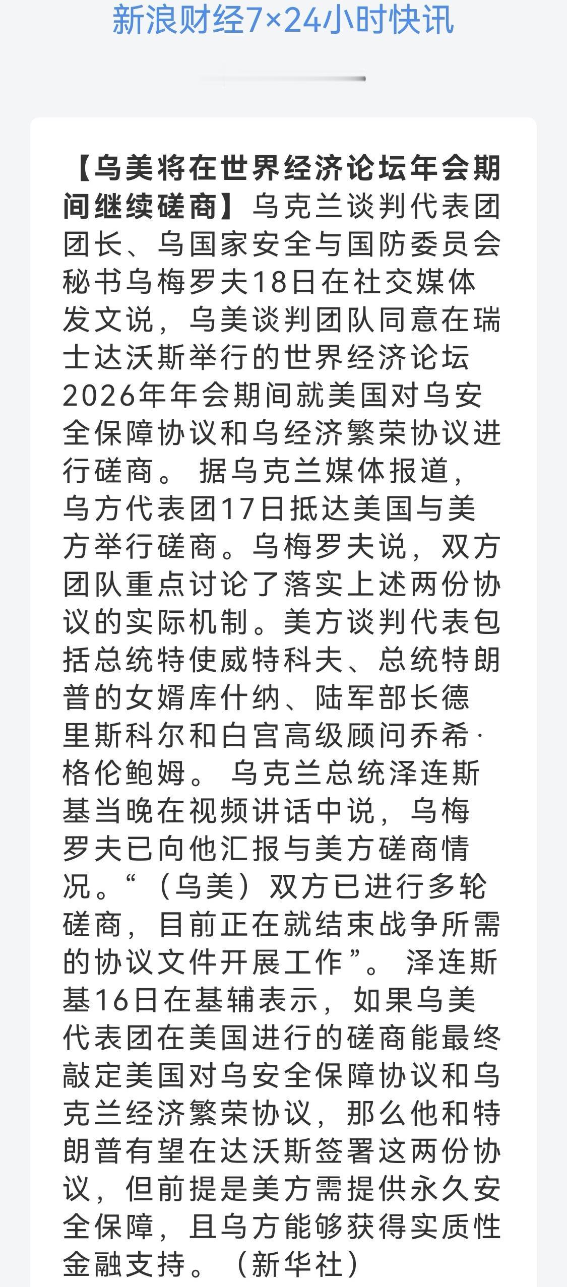 俄乌和谈进展~乌方要保障 欧美只为钱 新华社转发乌克兰谈判代表团团长乌梅罗夫18日社交媒体发文:乌美谈判团队同意在瑞士达沃斯举行的世界经济论坛2026年年会期间就美国对乌安全保障协议和乌经济繁荣协议进行磋商。泽连斯基表示,如果乌美能最终敲定美国对乌安全保障协议和乌克兰经济繁荣协议,那么有望签署,但前提是美方需提供永久安全保障,且乌方能够获得实质性金融支持。 永久安全保障,首先他为什么要给你提供保障?你一个欧洲国家,他给你提供保障,面对的是大鹅,拥有世界性破坏武器,他吃饱了撑的?符合他的利益吗?他这是保护欧洲,他愿意吗?还永久性,你是他爹?据说有一版,特朗普说“保障要掏钱”,这倒有可能。第二经济繁荣协议,找钱让你繁荣?特朗普自己都在用“灌水”压迫各个盟友“拿钱投资美国”,“让美国再次伟大”,凭什么找钱“让乌克兰再次伟大、繁荣”?所以特朗普才说泽连斯基才是“和平的最大障碍”,你这都是“战胜国才有的待遇”,你说的他无法满足,才说你就是故意提要求阻碍。 不仅仅乌克兰要钱,美国也要钱,只不过已经把乌克兰所有有价值资产设立了基金,慢慢还。再看看欧盟,没有抢到基金,咋办。看看欧盟大聪明匈牙利总理:欧尔班17日表示,欧洲经济面临衰退风险,欧盟却继续给乌克兰提供巨额贷款。他强调,乌克兰不可能偿还欧盟贷款,欧盟近期正在讨论如何迫使俄罗斯向乌克兰支付战争赔偿,从而偿还欧盟贷款,这完全是不切实际的幻想。 欧盟的会议正在变成军事会议,西欧正在堂而皇之地为与俄罗斯开战作准备。 德国、法国等国家正在讨论,打算如何打败俄罗斯人,如何迫使他们支付赔偿金,如何拿回给乌克兰人的钱。当然战争现在找的是“代理人”,也就是“乌克兰”,欧尔班在危言耸听,既然找了代理人,就说明自己永远不想亲自下场,否则打败了多难看。支持乌方永远打下去,除非大鹅认输。出钱赔偿,欧盟把贷款拿回来,至于乌克兰繁荣计划,欧盟还在想着自己繁荣呢。 反正现在就是不管乌克兰赢了还是输了,你大鹅必须赔偿,不管你是战胜国还是战败国。关键就是乌克兰赔不起啊。再看看欧盟委员会主席冯德莱恩在瑞士达沃斯发表讲话表示:欧盟决定永久冻结俄罗斯资产,并保留使用这些资产的权利。就是说不管你签署的什么协议,我的贷款必须还回来!我出钱找代理人挑衅你大鹅,弄得你遍体鳞伤,你大鹅还必须为我花钱挑衅你负责。你要是美国,强大的令人敬畏还有情可原,现在呢? 大鹅看破了,不抱希望,已经开启以前不曾采用的破坏模式,攻击能源基础设施,照着“毁灭完再重建”。泽连斯基在做梦,欧盟还在搅屎棍,特朗普为了诺贝尔和平奖“尊重现状,投降行不行”。欧盟:投降~战败国~人财两空。不行,乌克兰,为了皿煮正义,和大鹅继续干~~ (图片源自网络侵权告知删除)