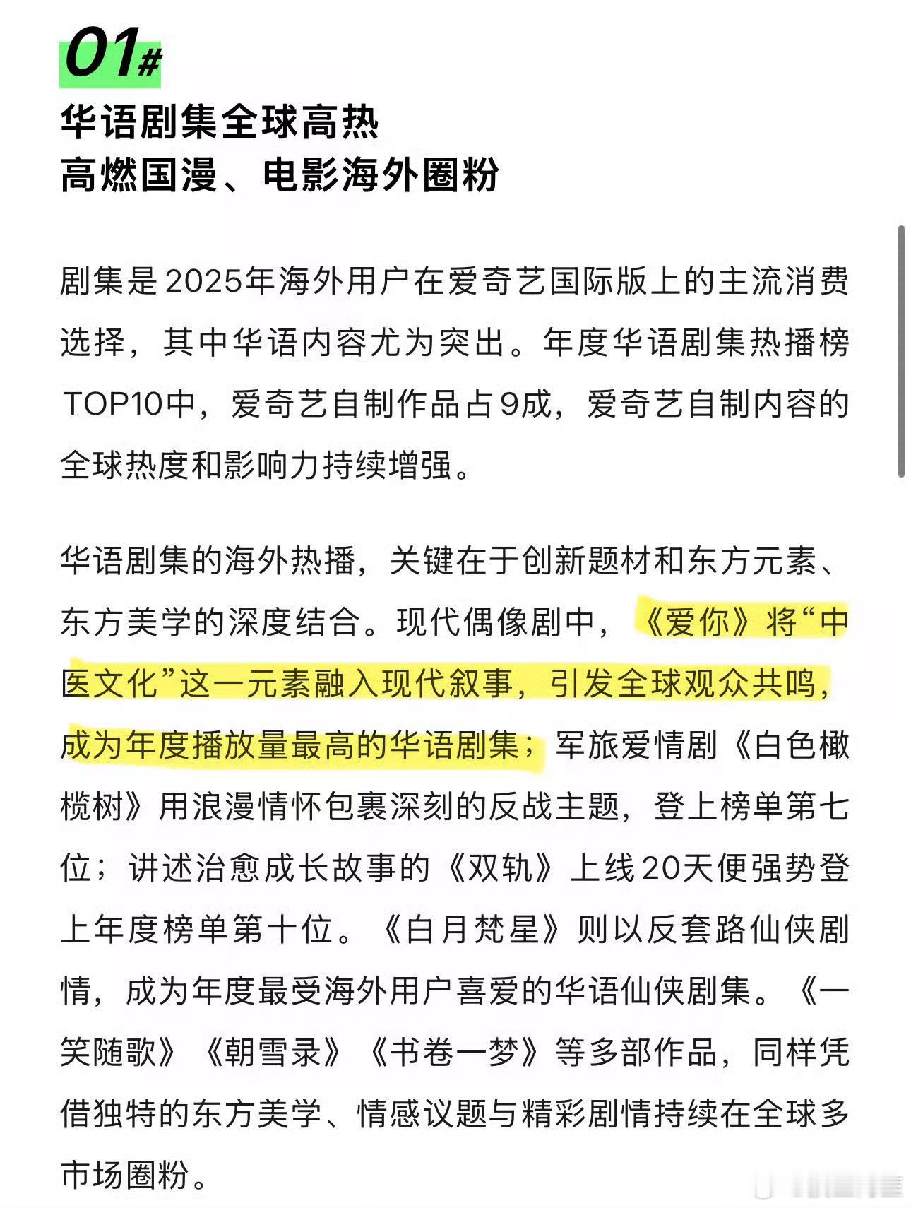恭喜张凌赫《爱你》拿下25年🥝国际版全球热播华语剧集第一。这部剧已经是爱奇艺官方认证的国内现偶年冠,国际版爱奇艺年度播放量TOP1的华语剧集了。何苏叶毫无疑问就是张凌赫的代表角色!