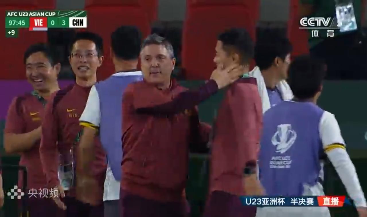 我们赢了,中国队3比0完胜越南,让越南队净吞3蛋,中国队不进就不进,一进就进3个,中国队太牛啦!我们进U23亚洲杯决赛了,中国队创造了奇迹!真的太开心啦! 安东尼奥首发阵容换了6人,A计划用一半替补打越南,安东尼奥战术太对头了,上半场压着越南队打,向余望和蒯纪闻表现出色,下半场开场才1分钟,彭啸就头球破门,几分钟后向余望禁区抽射破门,中国队2比0领先越南,安东尼奥B计划还没有用,不能浪费了,王钰栋和拜合拉木王炸上场,王钰栋任意球立即助彭啸再次头球破门,可惜被吹了,越南队输不起打人犯规,红牌,中国队继续猛攻,完全血脉压制越南队,拜合拉木错失2次进球良机,补时拜合拉木将攻补过,助攻王钰栋垫射破门,中国队摧枯拉朽3比0大胜越南队,打越南队打回老家。 恭喜中国队进U23亚洲杯决赛,决赛中国队将对阵日本,中国队加油!争取拿下日本队夺冠!中国必胜!中国队加油!