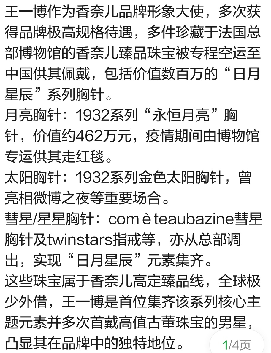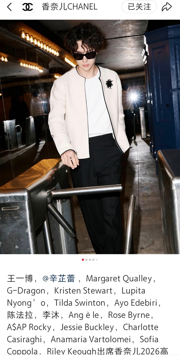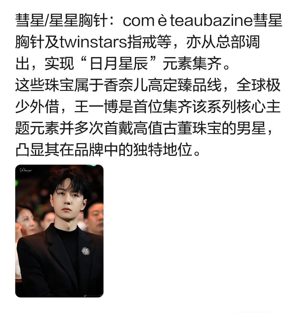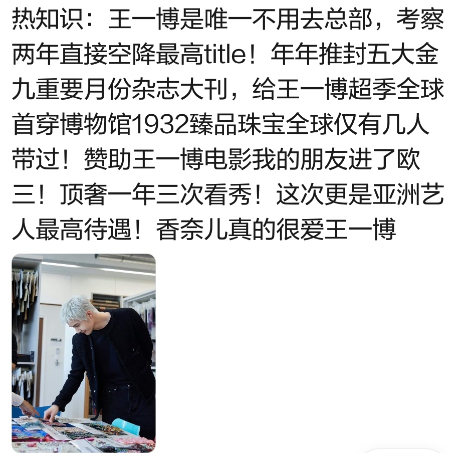 顶奢香奈儿能给的待遇都给王一博了王一博香奈儿品牌形象大使 1️⃣品牌最高title,合作即全线 2️⃣王一博是首位横跨LVMH、开云及法国皮诺三大奢侈品集团并持有最高title的亚洲艺人,打破行业百年竞业惯例 3️⃣香奈儿为其生日铺设地广,创下品牌为代言人定制生日广告的先例 4️⃣推封VOGUE王一博实现五大女刊封面满贯 5️⃣看秀待遇:秀场首秀,活动压轴,六大高级成衣系列亚洲首位大满贯6️⃣香奈儿为王一博拍电影《我的朋友》入围柏林国际电影节短片竞赛单元