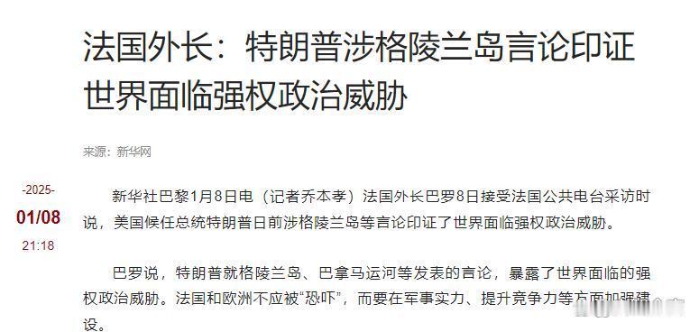121日,据央视新闻客户端报道,昨天,法国外交部长巴罗(图1)称,格陵兰岛属于欧洲领土,既不出售,也不允许掠夺。 格陵兰岛永远屌格陵兰岛人民,永远属于欧洲,概不出售。 评论,美国总统特朗普夺取格陵兰岛与欧洲国家处于白热化了!盟友也相互撕杀,如果美国武力夺取格陵兰岛,北约国家彻底解体。[呲牙][呲牙][呲牙][呲牙][呲牙][呲牙][呲牙]