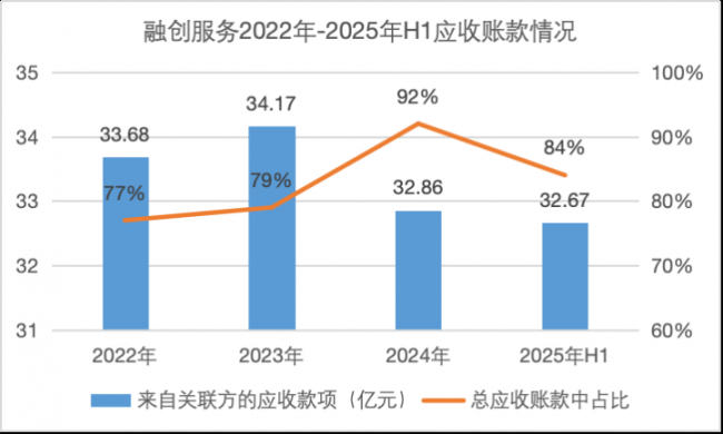 其中,来自关联方的应收款项规模分别为33.68亿元、34.17亿元、32.86亿元、32.67亿元,分别占总应收账款的77%、79%、92%和84%。