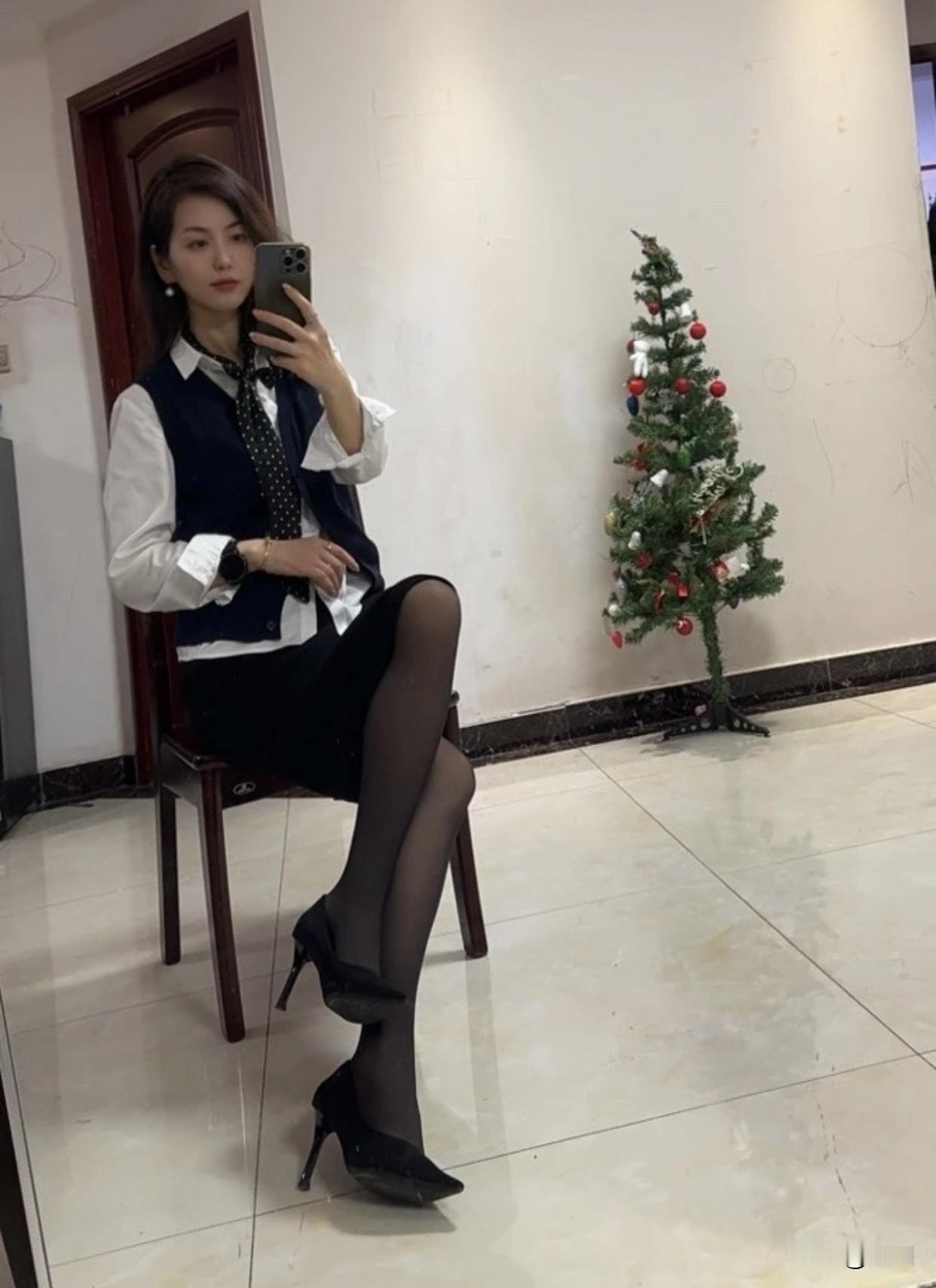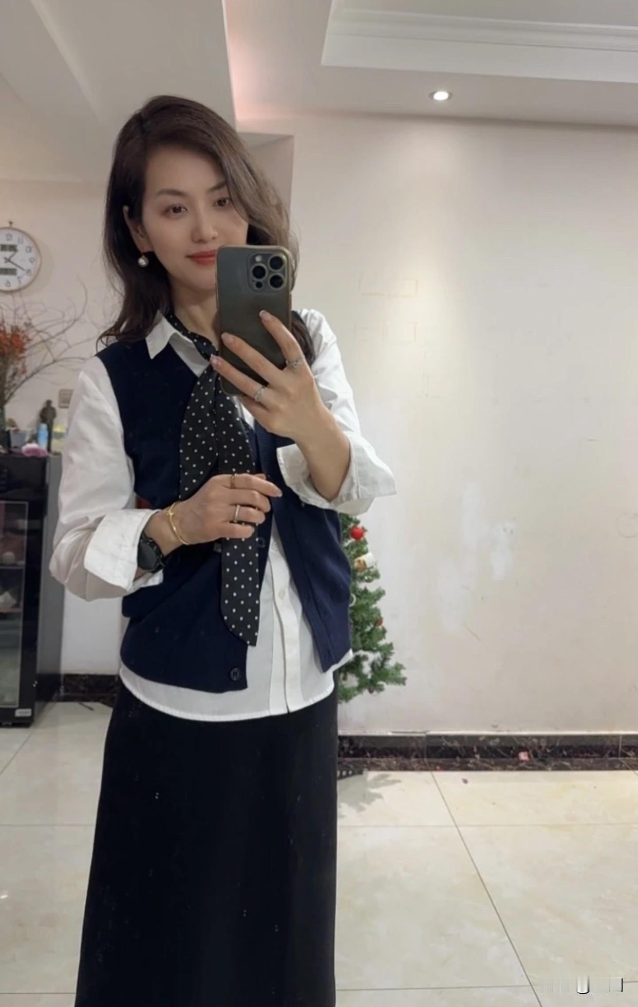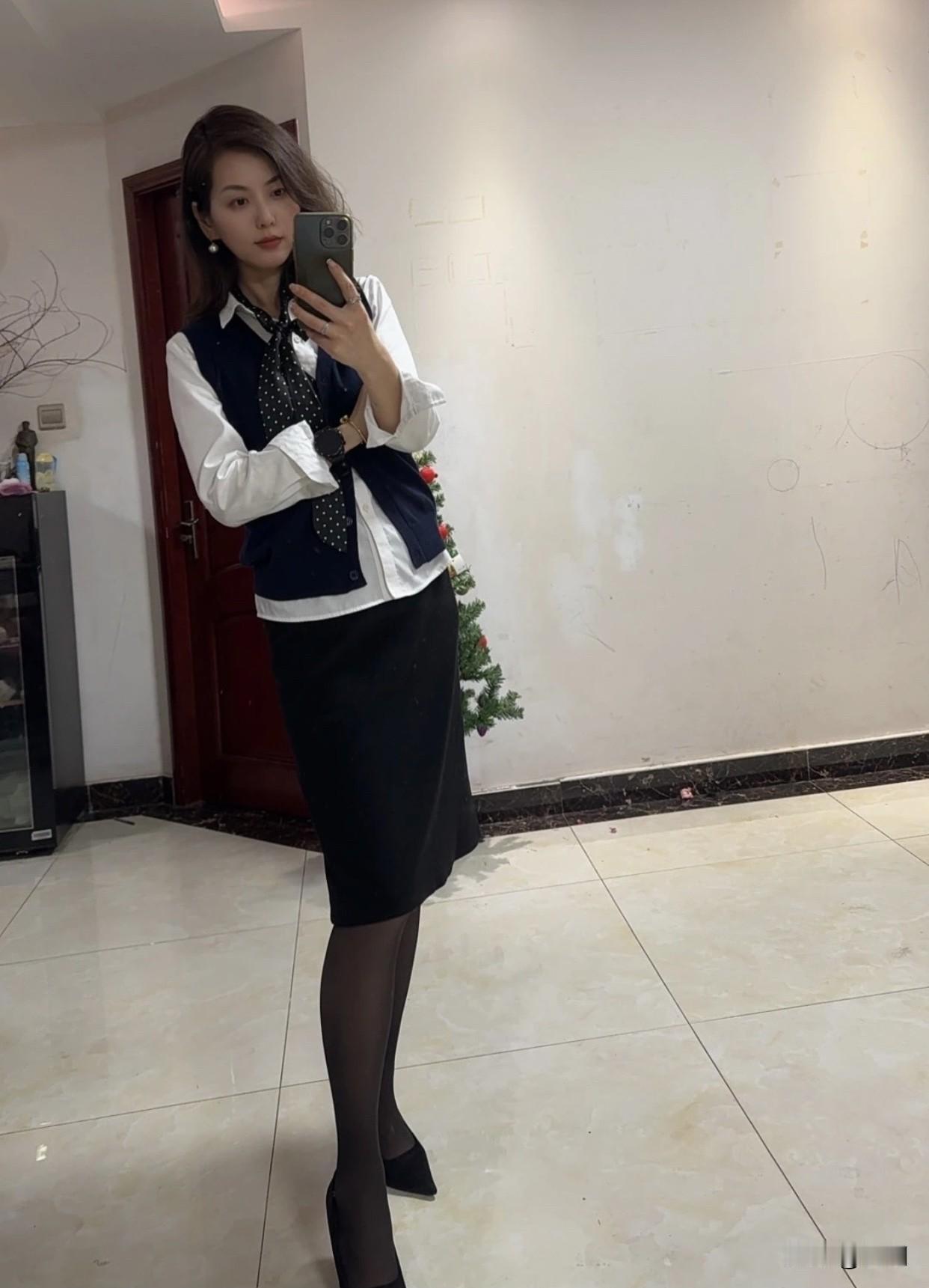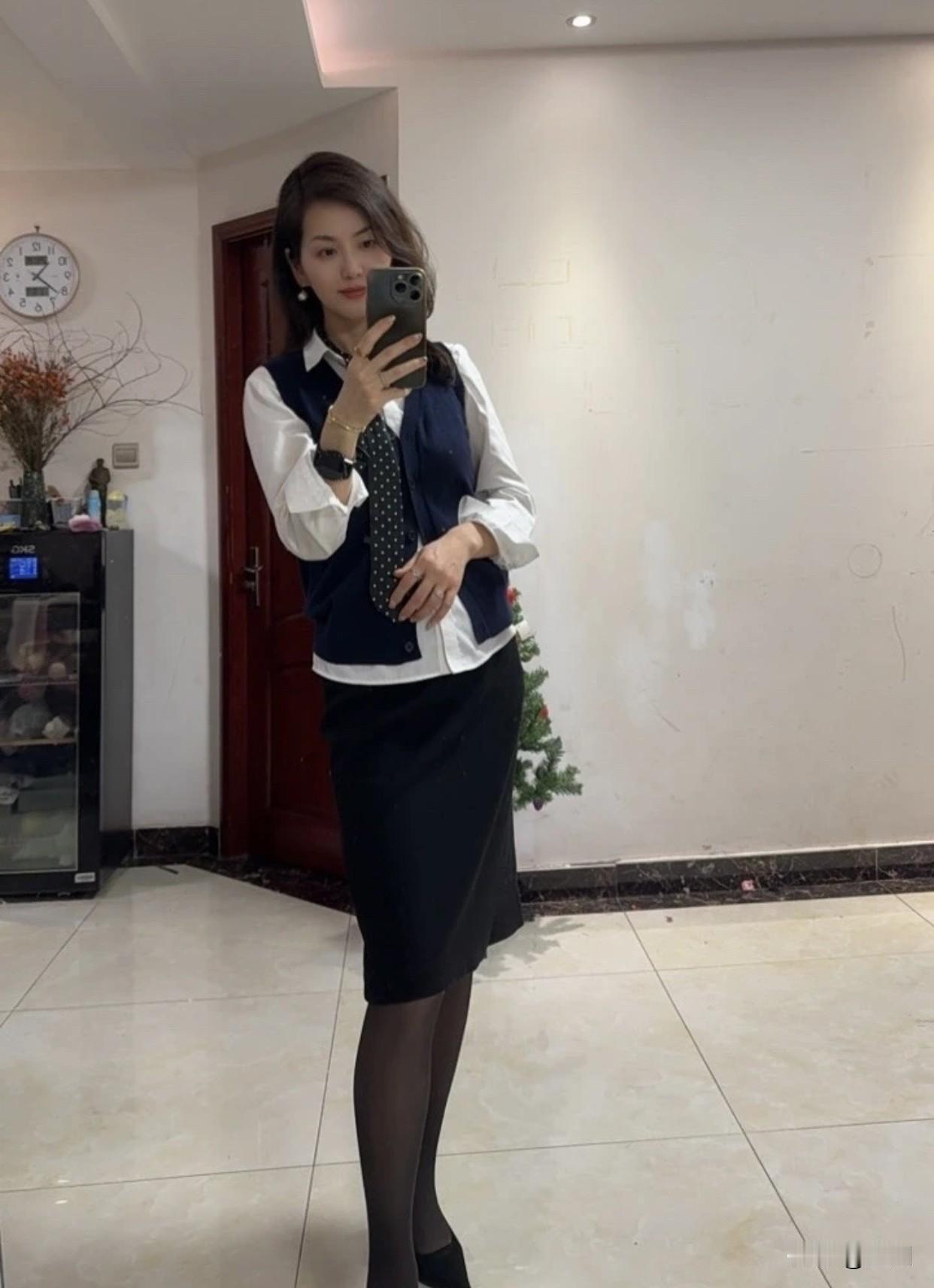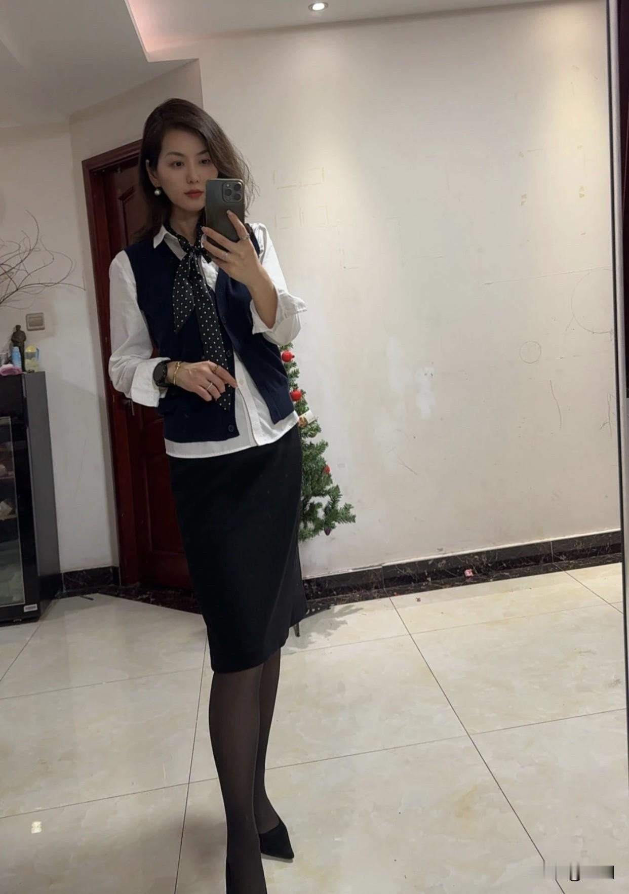 职场女性怎么穿着显得干练蓝色马甲和白衬衫搭黑色过膝群职业范儿十足