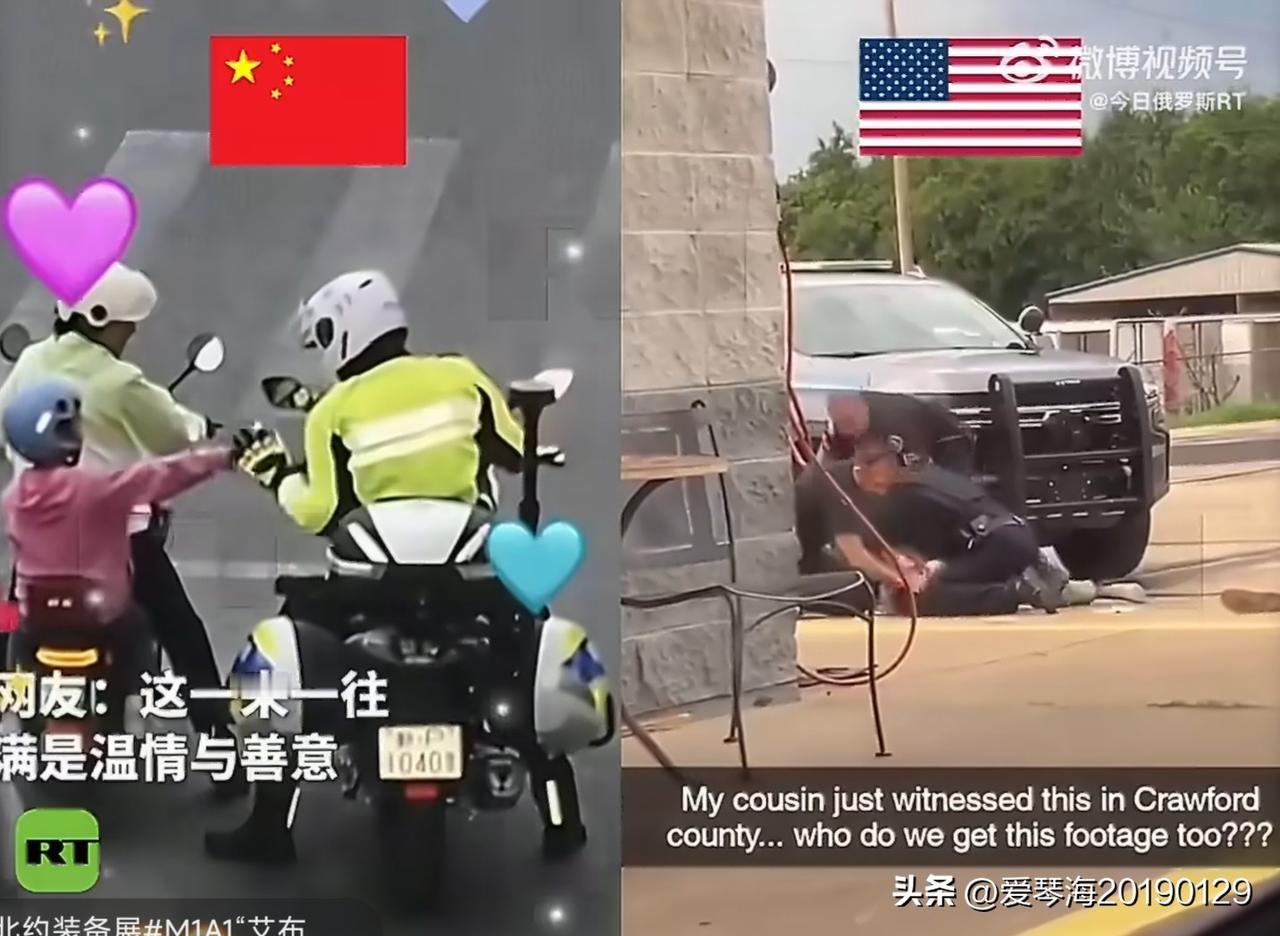 我们的人民警察看到坐摩托车的女孩头盔戴的不规范,耐心给女孩纠正并且帮她戴好,女孩则把手里的棒棒糖送给警察叔叔吃。而美国警察遇到有问题人员,二话不说就是粗暴摁到地上,如遇反抗则有可能一枪爆头。中国警民温馨关系的一幕和美国执法图片形成鲜明对比。一暖一冷,一柔一刚,这样的对比,无需过多言语,就足以让我们明白:能生活在一个充满温情与安全感的国度,是何其幸运! (图片来自网络截图)