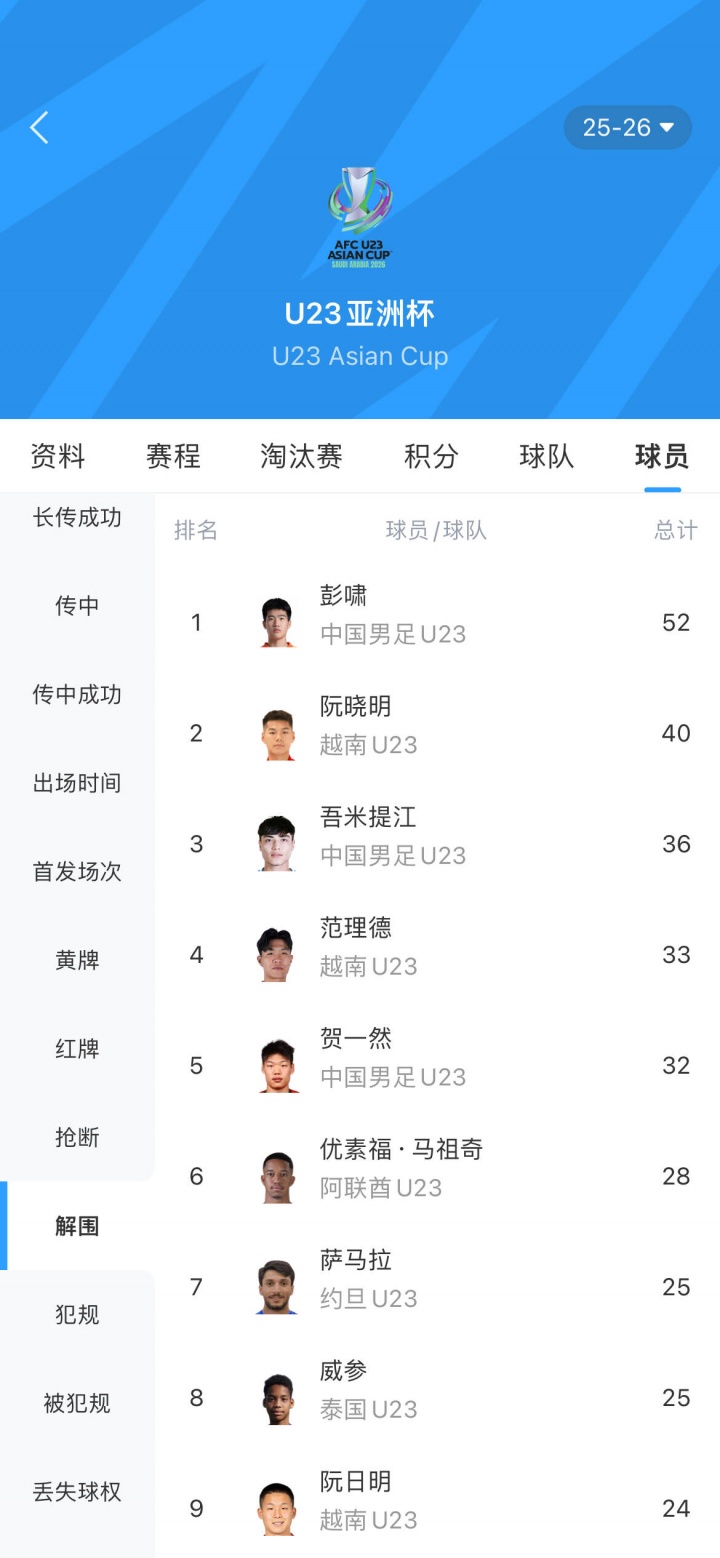 直播吧1月21日讯 U23亚洲杯,U23国足3-0击败越南U23,成功晋级决赛。赛后,本届赛事数据更新,在赛事解围次数榜单上,彭啸以52次领跑!
