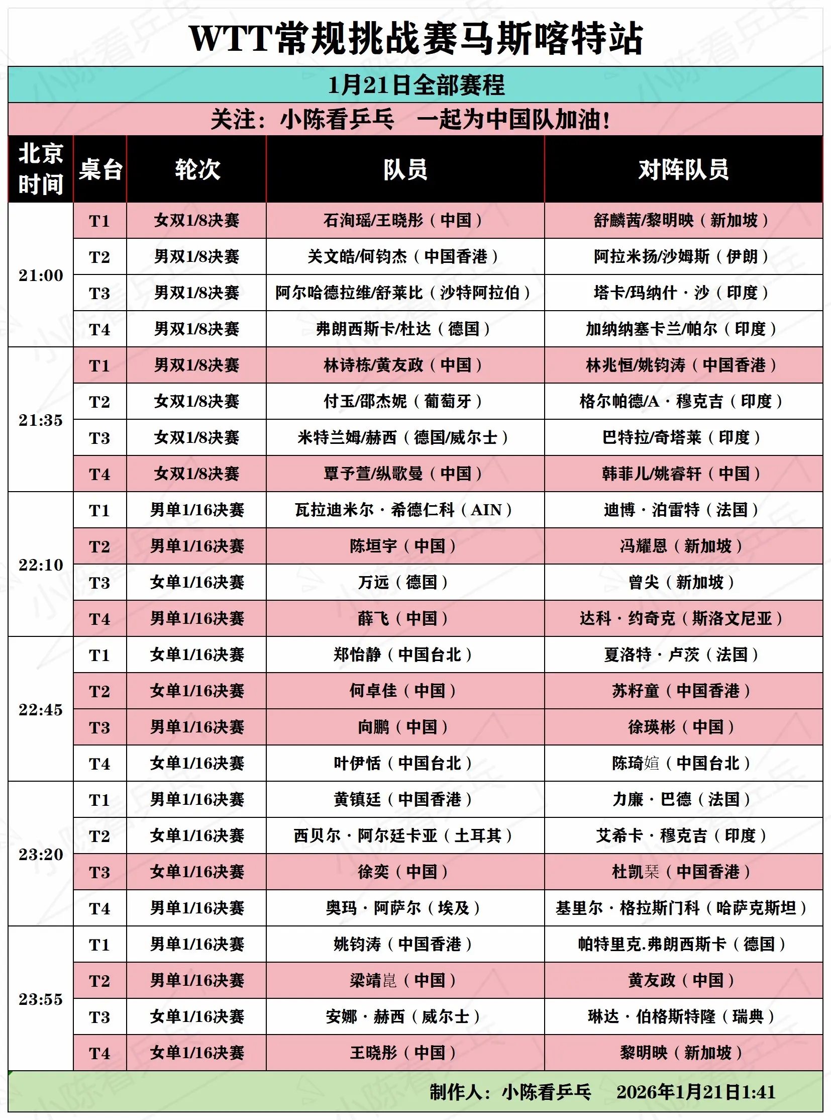 WTT马斯喀特常规挑战1月21日全部赛程。WTT马斯喀特常规挑战1月21日全部赛程,男女单打1/16决赛,双打1/8决赛,中国队加油。