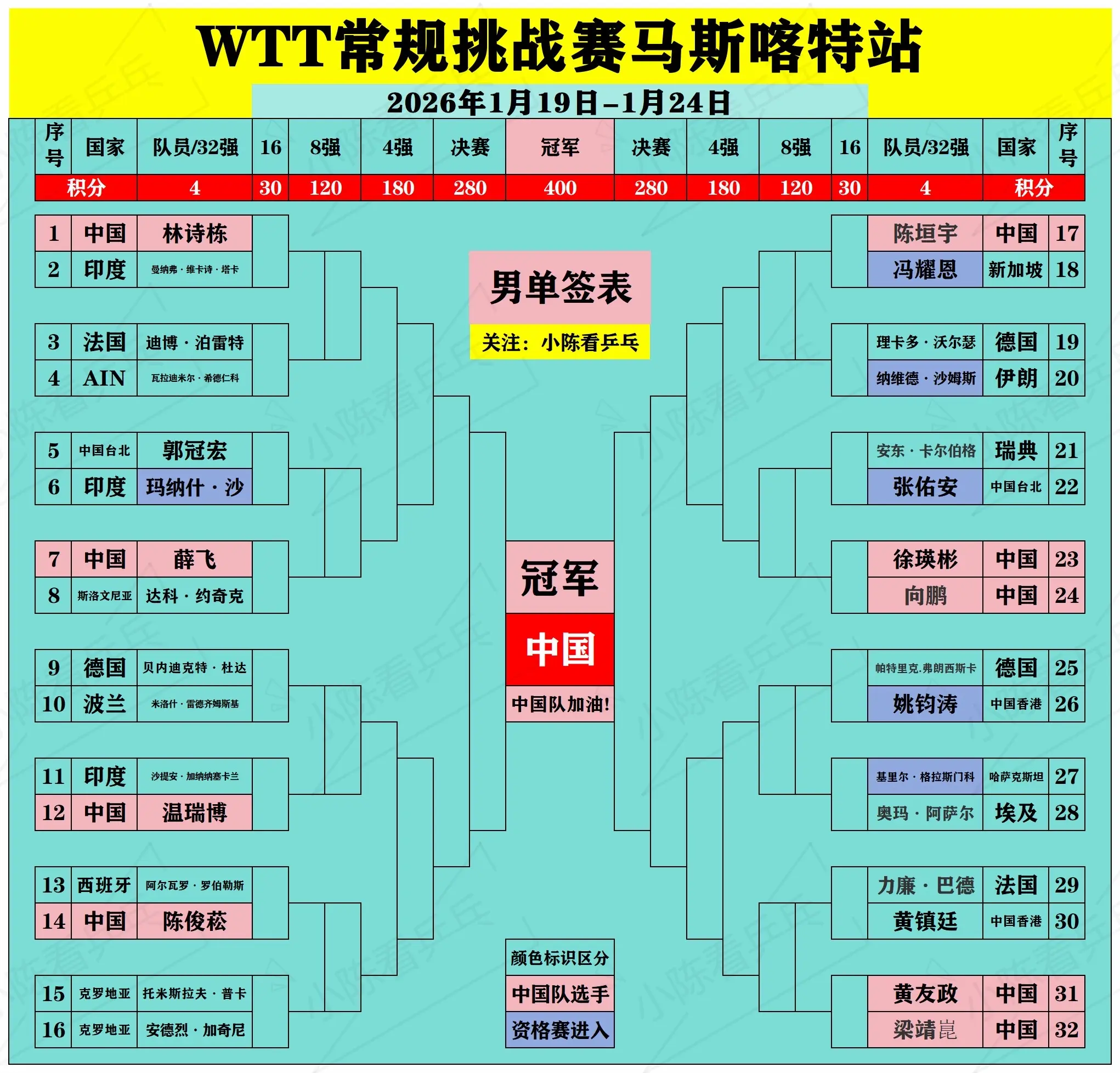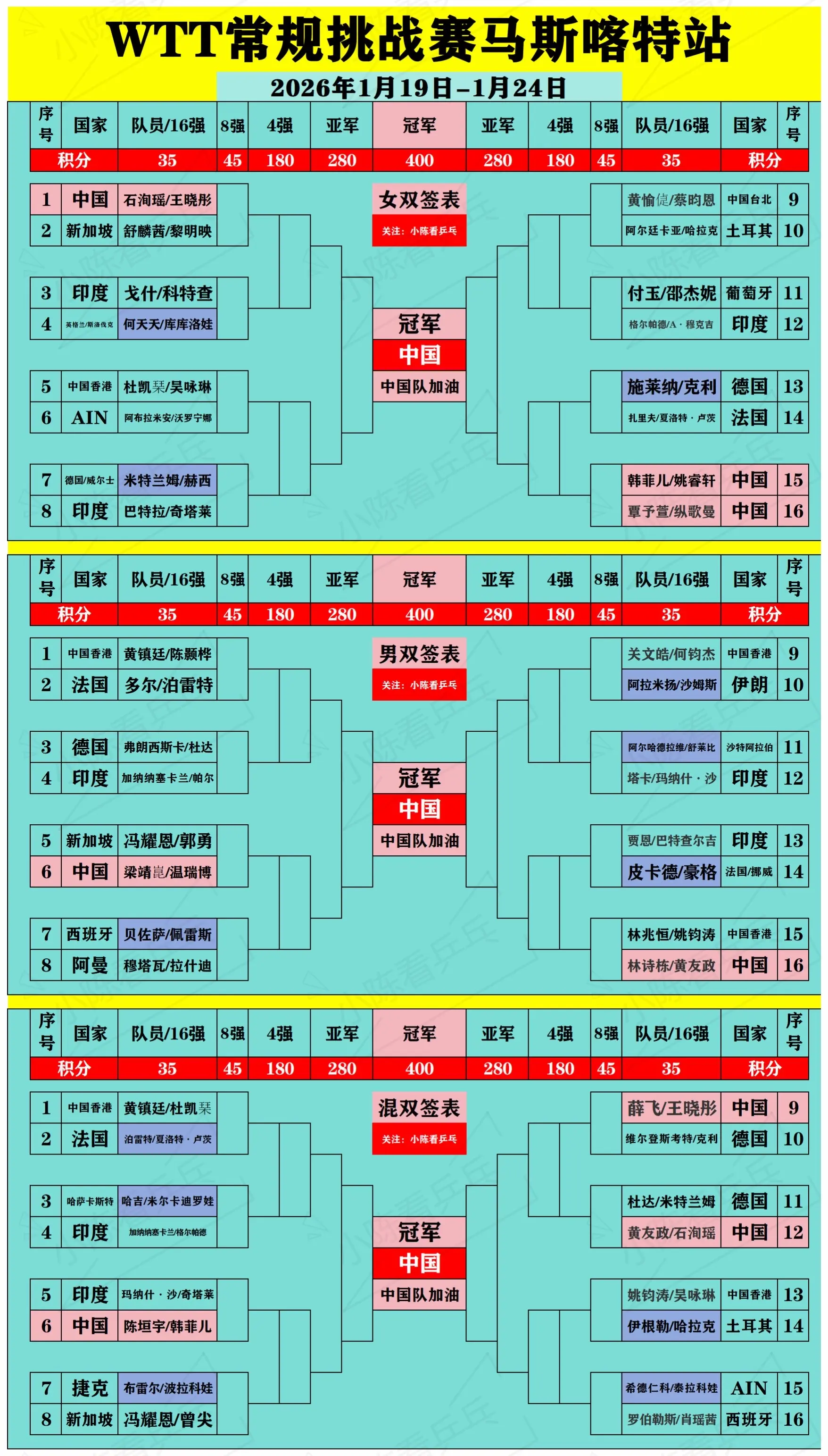 WTT马斯喀特常规挑战赛正赛完整签位图。WTT马斯喀特常规挑战赛正赛完整签位图,资格赛进入的已经入位,中国队继续加油。