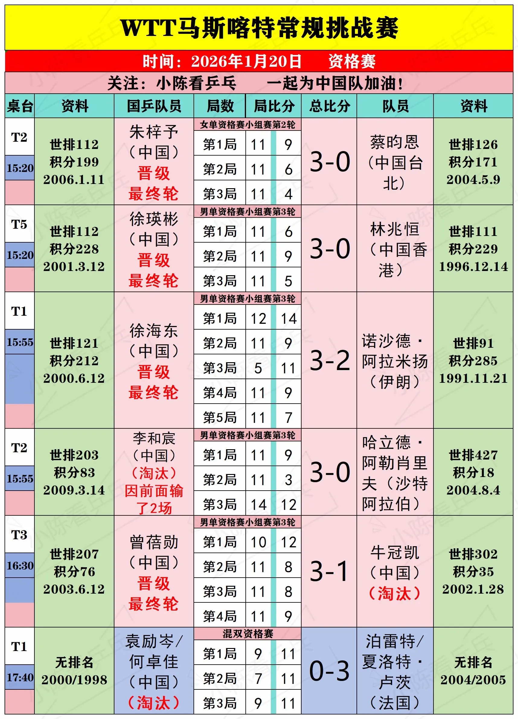 WTT马斯喀特常规挑战赛1月20日上半场。WTT马斯喀特常规挑战赛1月20日上半场赛况,男女单打资格赛小组循环赛,中国队继续加油。