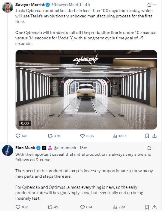 马斯克回应称:“需要特别指出的是,初始生产阶段通常都非常缓慢,并且会遵循一种‘S’型曲线的发展模式。产能爬坡的速度与新增零部件和工序的数量成反比。对于Cybercab和擎天柱来说,几乎所有东西都是全新的,所以早期生产速度会极其缓慢,但最终会达到惊人的速度。”