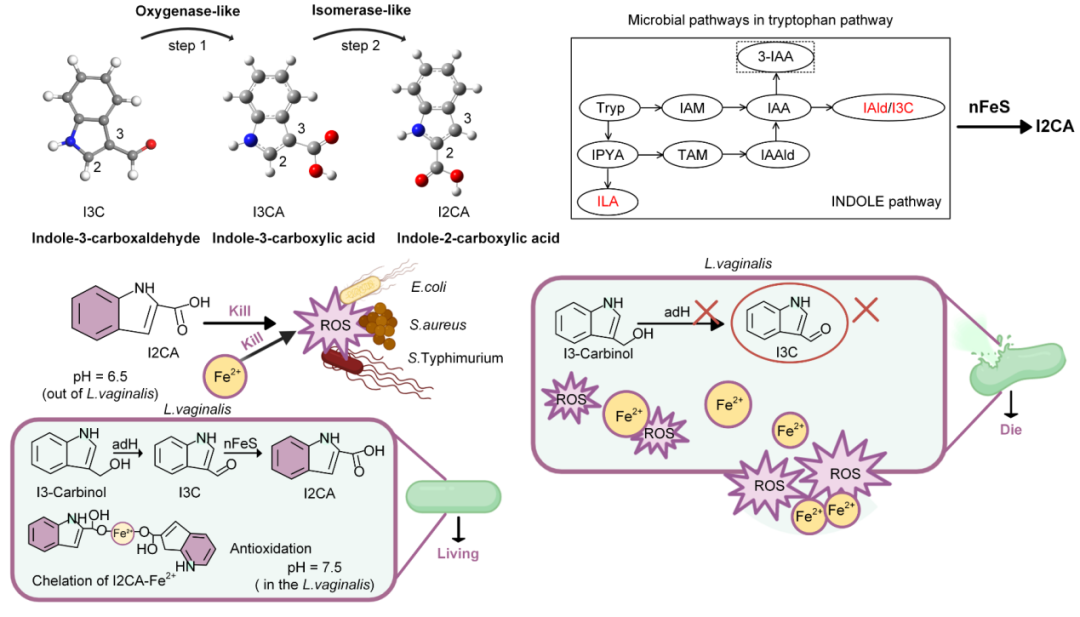 研究团队通过进一步探讨乳酸杆菌与铁硫纳米酶(nFeS)的相互作用,发现nFeS能够催化乳酸杆菌,使其代谢途径发生“抄近路”式的转变,并产生非天然代谢产物吲哚-2-甲酸。该产物能与亚铁协同,形成高效的杀菌“炸弹”,攻击致病菌。