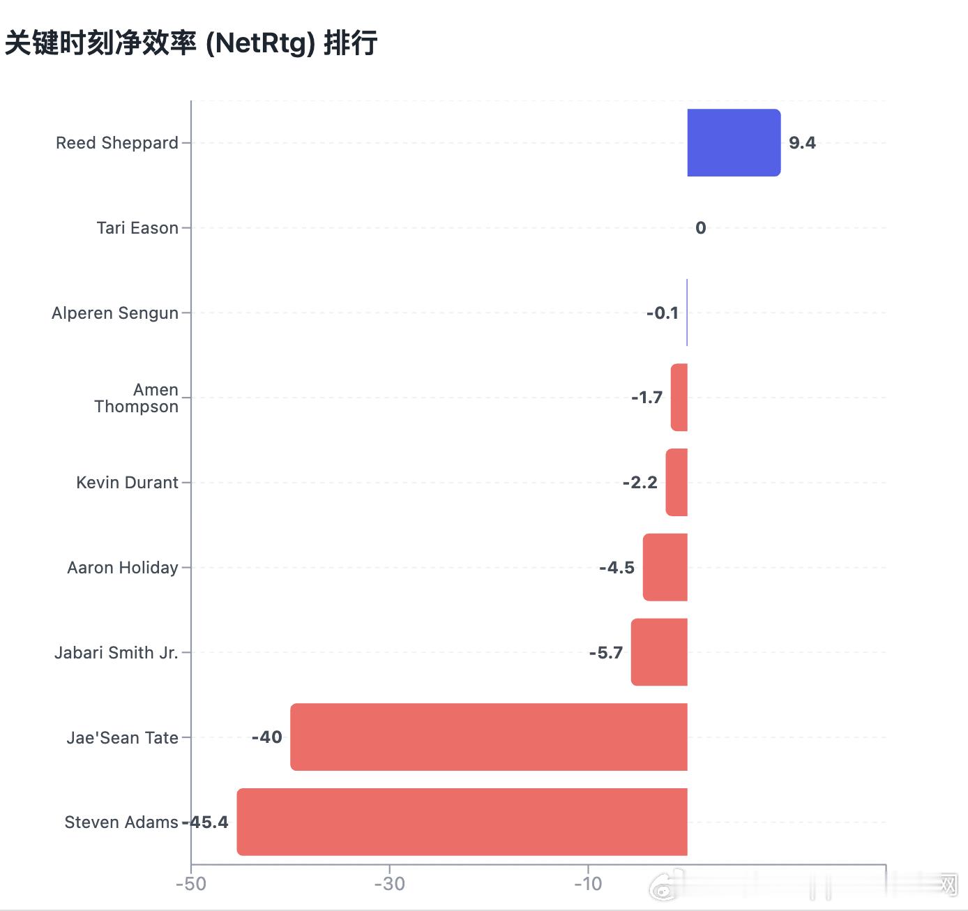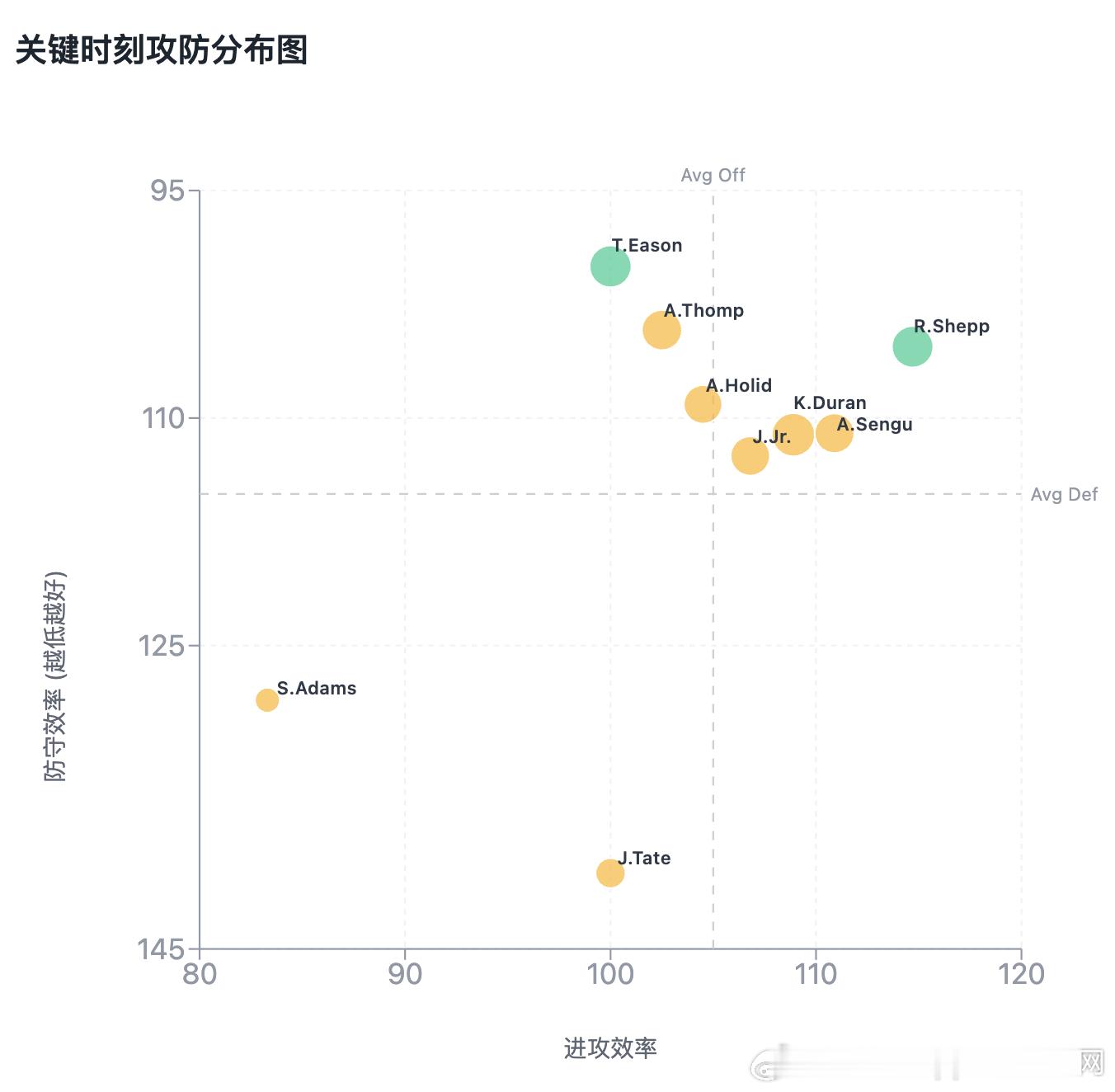 【火箭本赛季关键时刻球员攻防效率,使用率,净效率】图1火箭本赛季关键时刻球员净效率图2火箭本赛季关键时刻球员使用率和对胜利贡献图3火箭球员本赛季关键时刻攻防效率分布图(数据取自nba官网,python作图小结下就是:1.关键时刻火箭喜欢用申京,霍乐迪,kd,阿门(使用率前4)。霍乐迪打了12场关键时刻,火箭5胜7负。2.关键时刻伊森防守好,谢泼德进攻可以适当用3.关键时刻对胜利贡献,kd第1,伊森第2,阿门第3,史密斯第4,申京第5,这五个可以做一套阵容.)nba休斯顿火箭休斯顿火箭