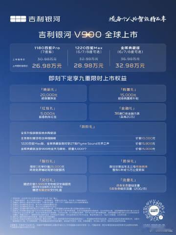 吉利银河V900全球上市26.98万元起吉利银河V900全球上市,定位AI全场景家庭旗舰MPV,限时指导价26.98万元起,下定享九重上市权益,不少消费者盼体验试驾。AI全场景家庭旗舰MPV金标吉利银河v900全球首秀吉利银河v900