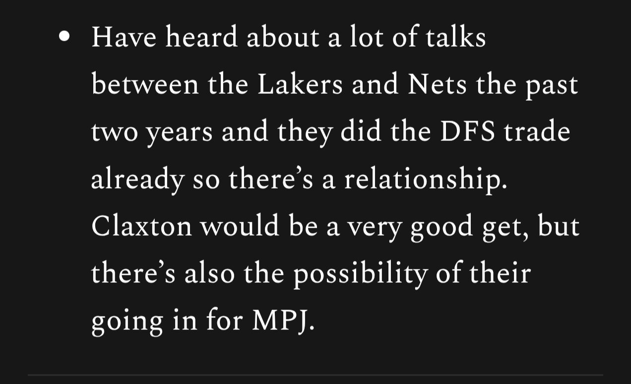 Action Network记者Hardwood Paroxysm:“过去两年里,我听说湖人和篮网之间有过多次交流,而且他们也完成了关于芬尼-史密斯的交易,所以双方是有合作关系的。克拉克斯顿会是一个非常不错的补强目标,但同时他们也有可能会去追求小迈克尔-波特。”湖人有意小迈克尔波特湖人有意小波特湖人vs掘金