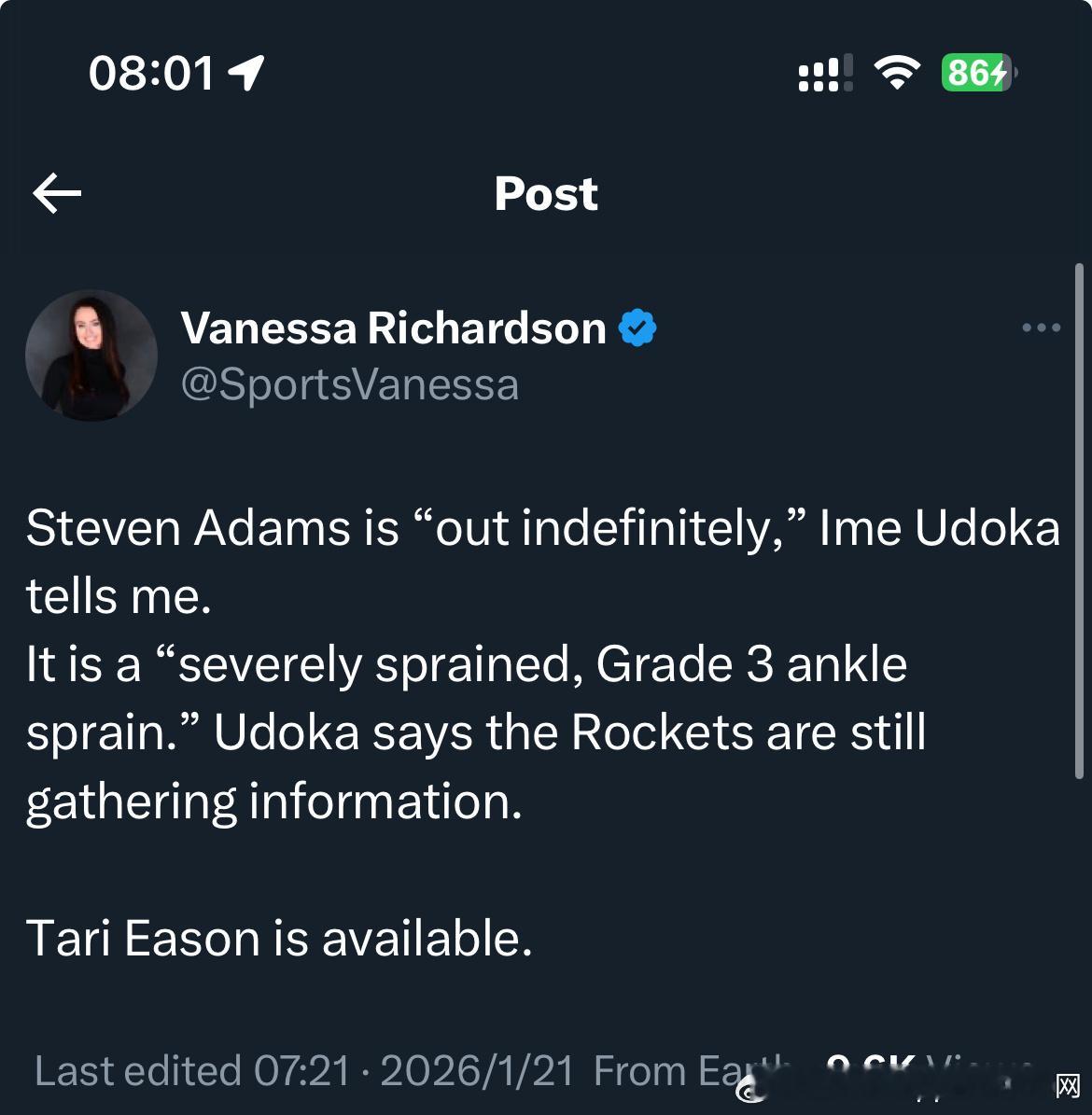 亚当斯是三级脚踝扭伤,无限期休战,火箭只是初步诊断,后续还会详细检查…并给出细节信息这类伤病一般需要最低6周时间恢复目前目标是在季后赛之前让亚当斯回归… 应该可以做到———(查了下美国医学专家对脚踝扭伤的定义一级踝关节扭伤一级踝关节扭伤属于轻度损伤。踝关节会出现轻微肿胀和压痛,这是因为韧带中的部分纤维发生了撕裂。通常可通过家庭护理的RICE方法(休息、冰敷、弹性绷带压迫、抬高患肢)进行治疗。二级踝关节扭伤二级踝关节扭伤指一根或多根踝部韧带纤维出现较严重的撕裂。踝部会出现压痛和肿胀,活动范围可能受限。踝关节可能感觉不稳定,尝试行走时会产生疼痛。三级踝关节扭伤三级踝关节扭伤意味着一根或多根踝部韧带完全断裂。医生检查时会发现踝关节稳定性丧失。患处明显肿胀且压痛剧烈,疼痛程度使患者完全无法承重行走。)休斯顿火箭休斯顿火箭