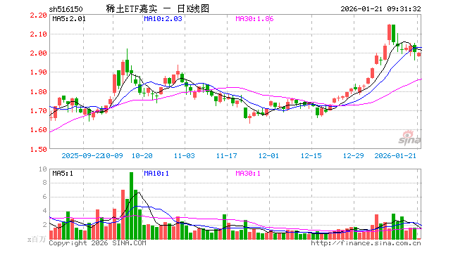 1月21日,稀土ETF嘉实(516150)开盘跌1.00%,报1.980元。稀土ETF嘉实(516150)重仓股方面,北方稀土开盘跌0.93%,卧龙电驱跌0.89%,领益智造跌1.10%,中国稀土跌1.00%,盛和资源跌1.30%,格林美跌0.99%,金风科技跌0.46%,包钢股份跌0.42%,厦门钨业涨0.55%,中国铝业跌0.68%。