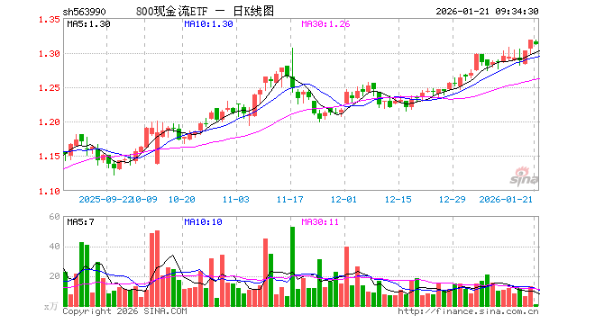 1月21日,800现金流ETF(563990)开盘跌0.15%,报1.316元。800现金流ETF(563990)重仓股方面,中国海油开盘跌0.03%,美的集团跌0.05%,格力电器涨0.05%,五粮液跌0.28%,中远海控跌0.27%,洛阳钼业跌0.82%,牧原股份涨0.09%,TCL科技涨0.20%,中国铝业跌0.68%,顺丰控股涨0.13%。