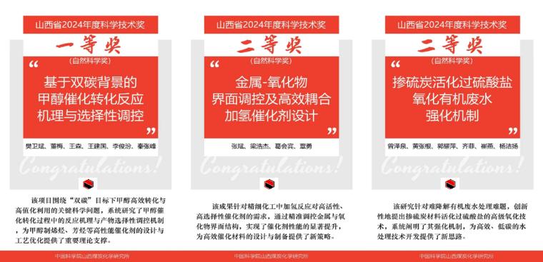 基础研究取得原创突破。痕量卤素精准调控费托反应,实现近零CO₂排放(低于1%)与高效烯烃生产(超过85%)的重大突破,成果在Science发表。甲醇催化转化研究成果获山西省自然科学一等奖,精准调控催化界面结构、有机废水高级氧化等两项成果获山西省自然科学二等奖。