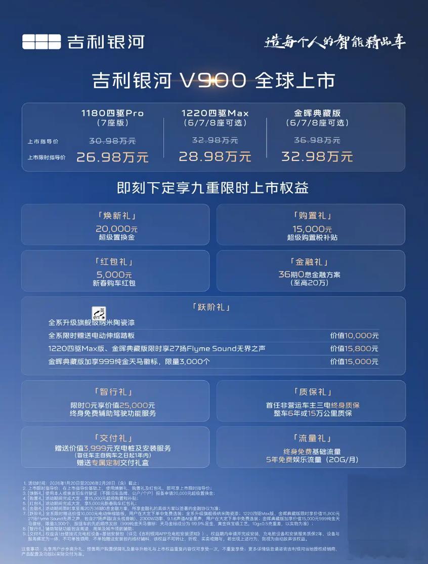 吉利银河V900上市:26.98万起1月20日,吉利银河旗下中大型MPV——银河V900正式上市,新车共推出3款配置,售价区间为30.98-36.98万,上市限时指导售价为26.98-32.98万。车身尺寸方面,长宽高分别为5360/1998/1920mm,轴距为3200mm。一车装下42人,创下“最多人装进一辆MPV”的吉尼斯世界纪录。内饰方面,该车配有10.25英寸仪表屏、19.8英寸AR-HUD、15.4英寸中控屏以及9.2寸高清流媒体后视镜,座舱为Flyme Auto 2系统,搭载骁龙8295P芯片。其他配置,二排提供17.3英寸娱乐屏,扶手处配备5.98英寸功能控制屏,全车拥有4个智能50W风冷无线快充。吉利银河V900得房率达到91.8%,全车提供42处收纳储物空间,其二三排纵向空间均超过1000mm,后备箱容积超过1000L可容纳15个20寸登机箱,并提供163L下沉储物空间。动力方面,吉利银河V900将搭载由1.5T发动机+双电机组成的增程动力系统,系统最大功率340kW,峰值扭矩523N·m,匹配宁德时代骁遥电池包,CLTC纯电续航为260km,满油满电综合续航为1220km。吉利银河V900全球上市26.98万元起AI全场景家庭旗舰MPV金标吉利银河v900全球首秀吉利银河v900 汽场全开