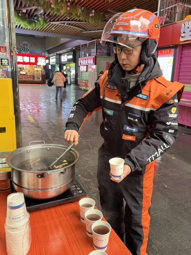 △外卖小哥赵承军为环卫工人、快递员递上热姜茶。