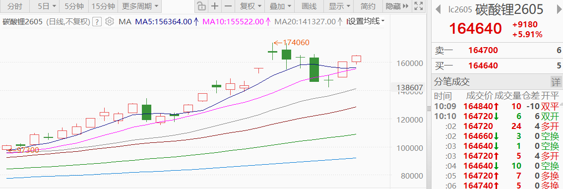 消息面上,碳酸锂价格再度上涨,碳酸锂期货主力合约碳酸锂2605两日大涨超11%。截至目前,碳酸锂2605期货上涨5.91%,报164640元/吨。