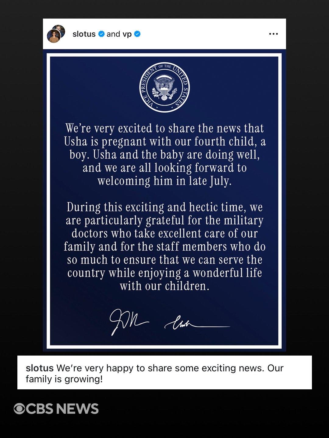 美国副总统 万斯JD Vance 和第二夫人 乌莎Usha Vance 周二宣布,他们即将迎来第四个孩子。 “我们非常激动地宣布,乌莎怀上了我们的第四个孩子,是个男孩,” 这对夫妇在Instagram上发帖说道。“乌莎和宝宝一切都好,我们都非常期待在七月下旬迎接他的到来。”