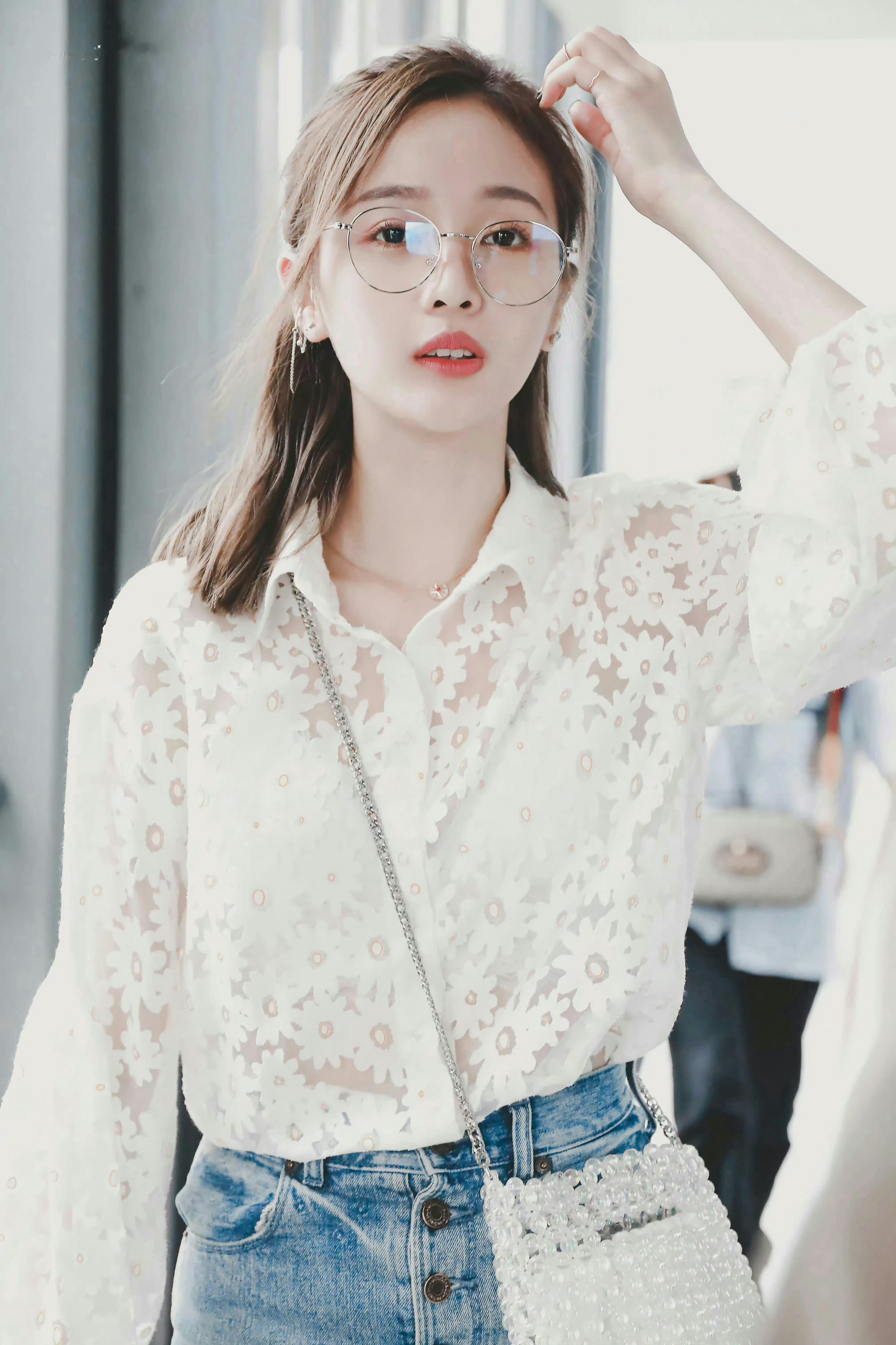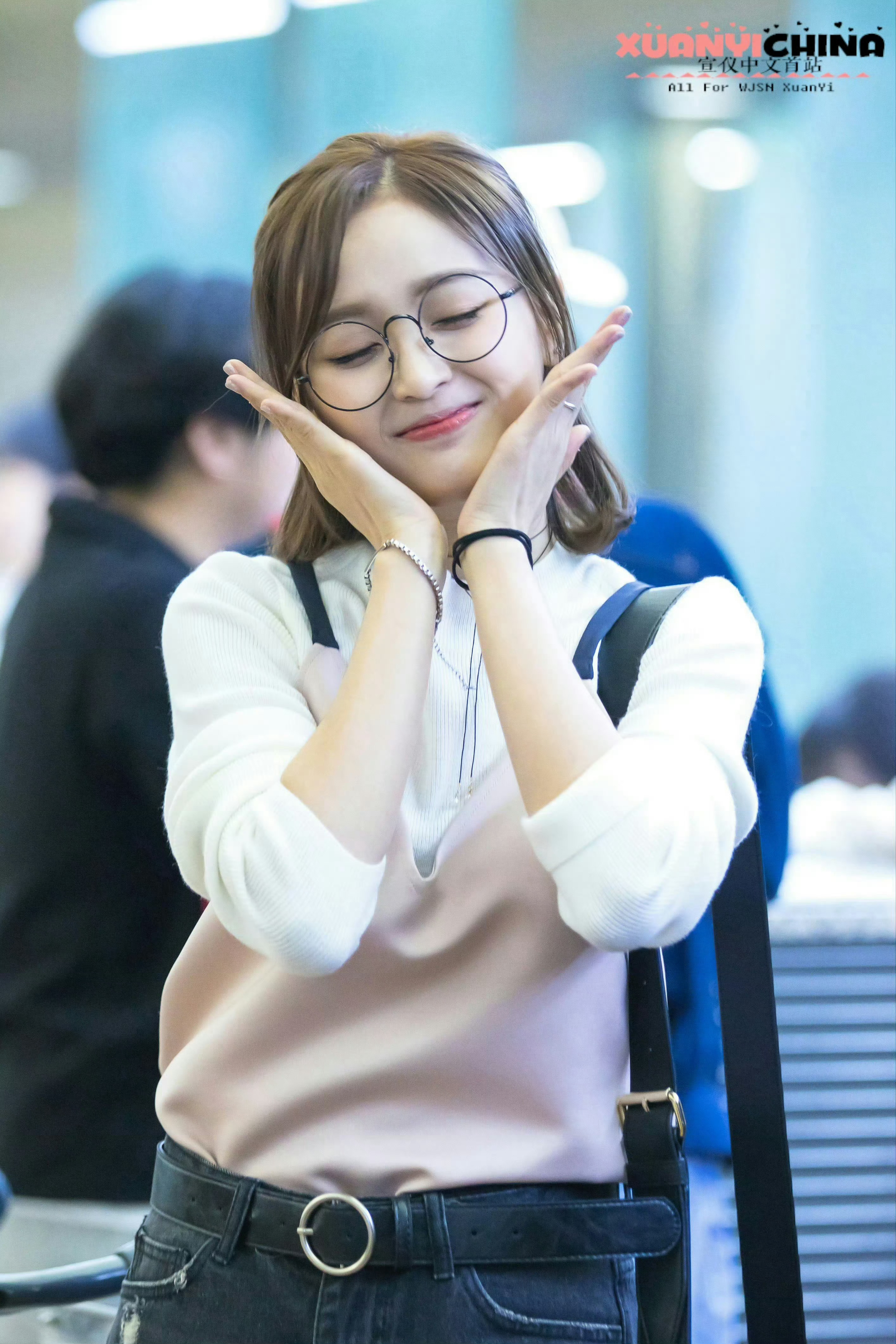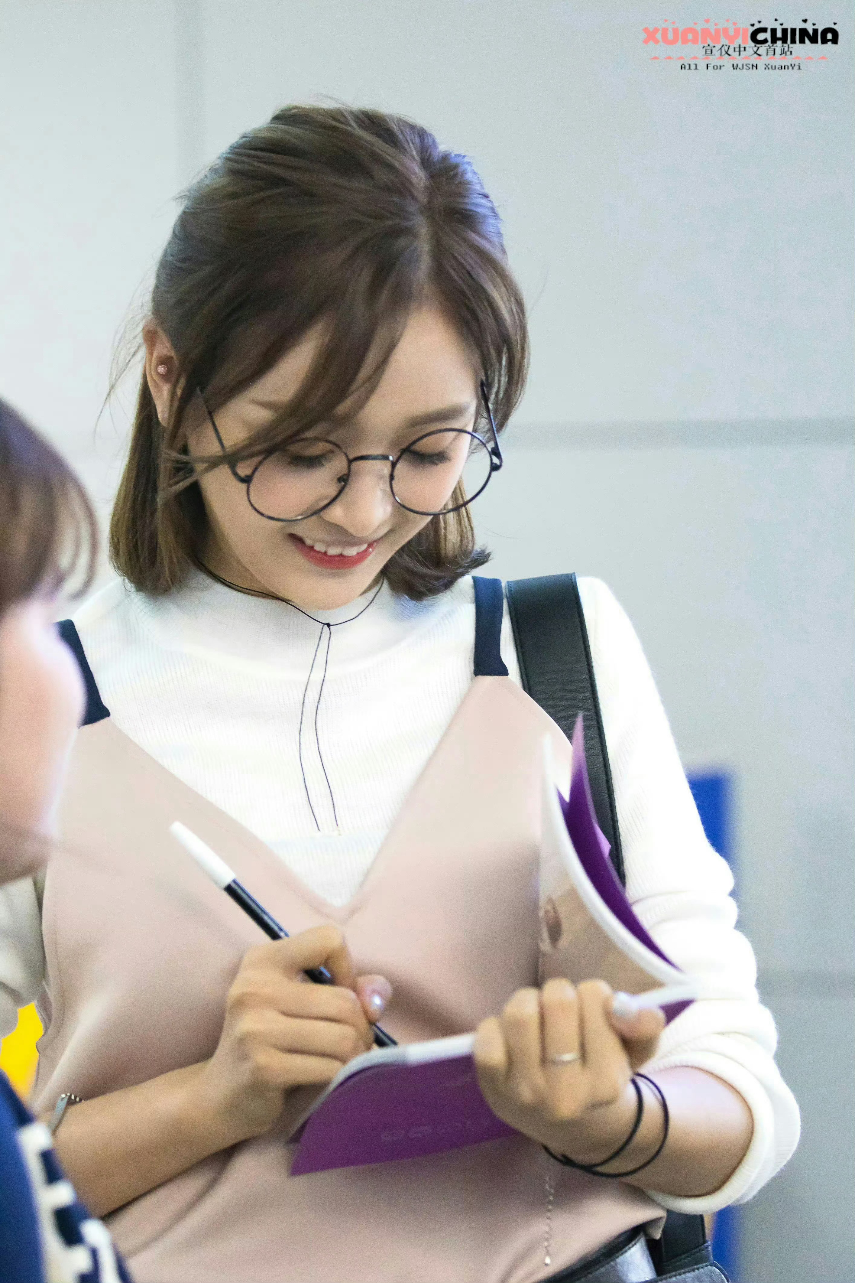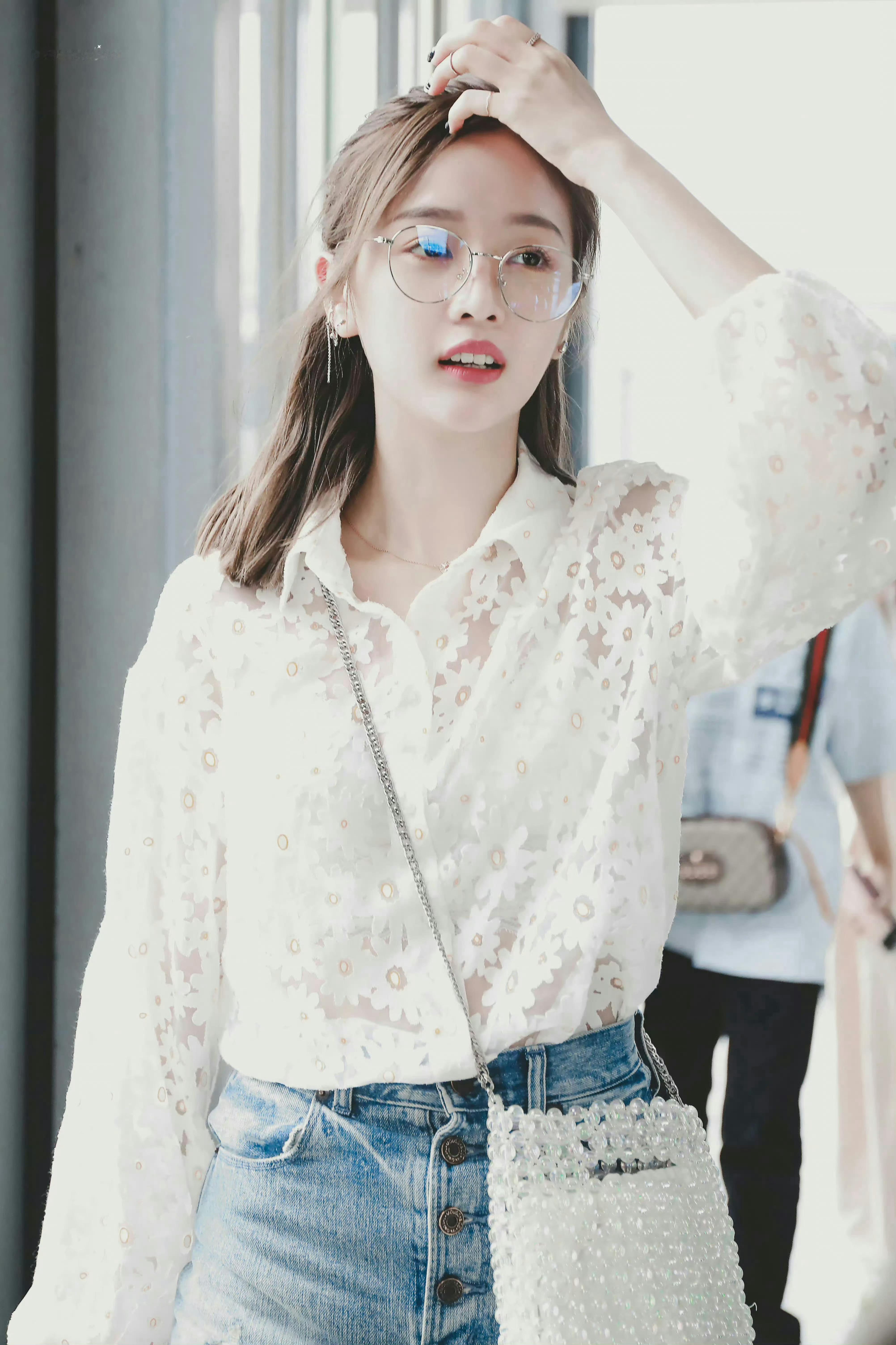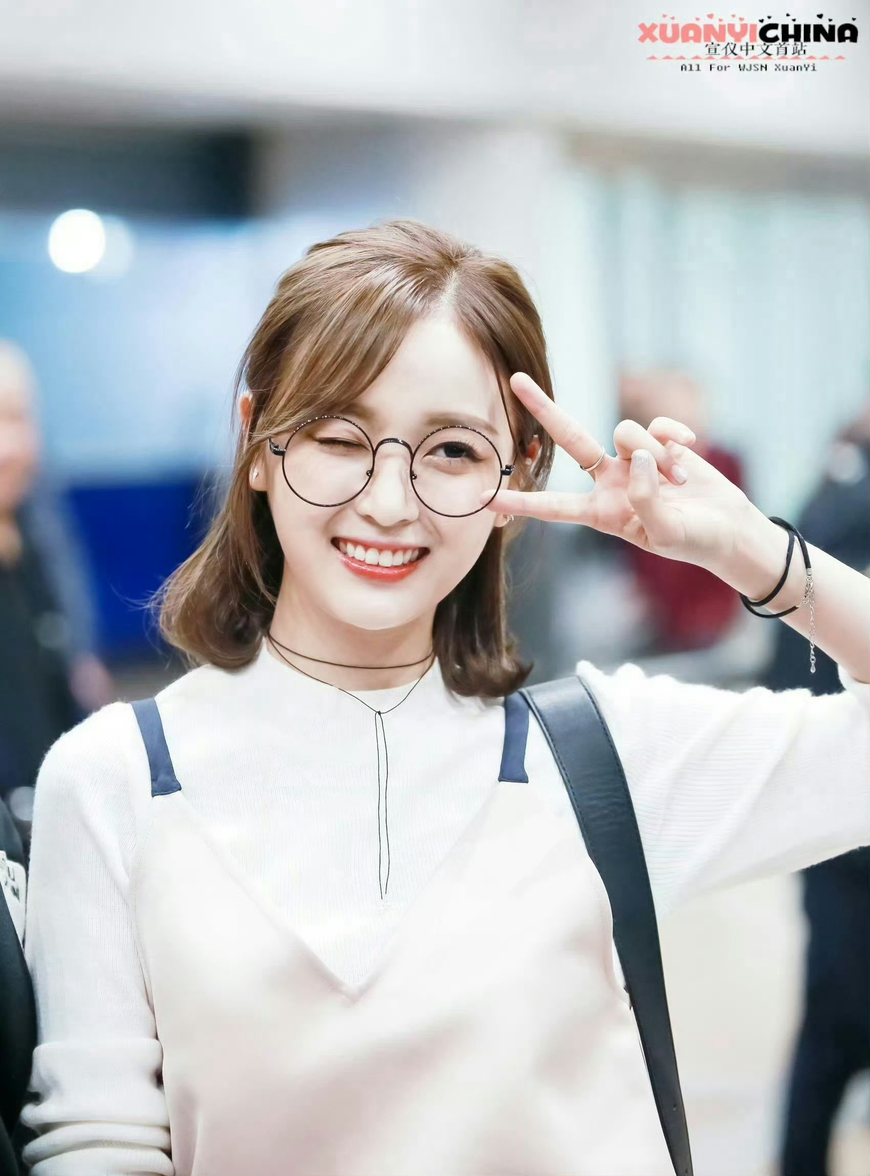 吴宣仪 黑框眼镜衬得眉眼更灵动,白衫配细颈链清爽又温柔,笑起来的梨涡甜得像把阳