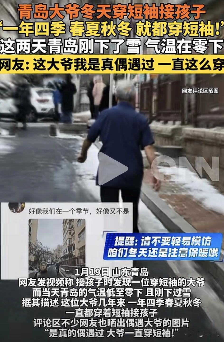 青岛大爷零下寒冬穿短袖接娃,网友:你da爷终究还是你da爷! (看完我默默裹紧了羽绒服…) 最近,青岛气温跌破冰点,寒风那个吹啊~街上行人全都全副武装,把自己裹得严严实实,唯独一位接孩子的大爷火了! 网友拍下震撼一幕:零下气温里,这位青岛大爷身穿干净短袖,淡定站在校门口等孩子。 周围羽绒服、棉大衣瑟瑟发抖,大爷却面色红润,步伐稳健,仿佛活在另一个季节! 网友神评论刷屏: “你da爷还是你da爷!” “青岛大爷:寒冷?不存在的!” “我穿秋裤都冻得哆嗦,大爷直接进入夏季模式!” “这不是穿衣,这是修为!” 这在青岛可不是个例!青岛海边常年有短袖冬泳大爷团,这群平均年龄65+的爷爷们,冬天海边光膀子下饺子(游泳)是日常操作。 一位青岛大叔笑说:“我们这儿大爷分两种,一种是普通大爷,一种是短袖大爷。后者属于‘地域级NPC’,抗冻属性点满了。” 不过呢,青岛这位大爷身体素质确实令人惊叹,但普通人千万别模仿!大爷如此高深修为是日积月累炼成的,对普通人来讲保暖才是冬季第一要务。 话虽如此,看着视频里大爷那从容的背影,还是忍不住竖起大拇指——这大概就是传说中的“血脉觉醒”吧! 很多网友更在评论区为大爷打call: “我们学校门口的接娃大爷,身体很棒!” “在我朋友的朋友圈见过这位大爷!” “接孩子三年了,这位大爷让我见识了什么叫身体素质好!” “我们在同一个季节,又好像不是!” “我学员家长,一年四季都这么穿!” 只是,咱们敬佩归敬佩,明天出门该穿秋裤还得穿秋裤! 素材来源:青岛新闻网,侵联删!