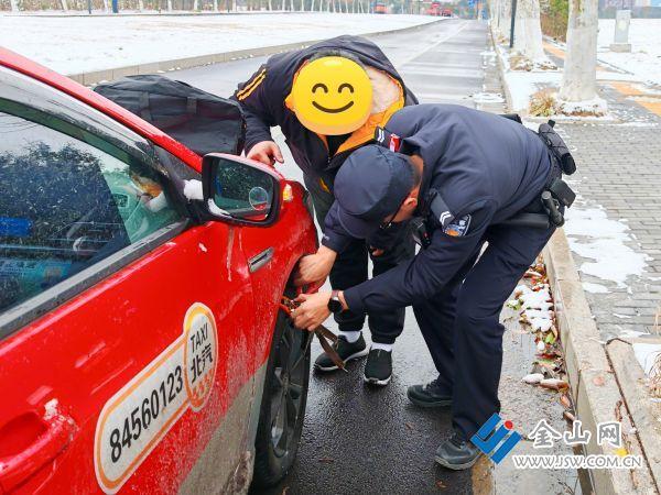 金山网讯“车在路中间动不了,后面已经堵了好几辆车!”1月20日,大雪纷飞,镇江经开区丁卯派出所接到出租车司机李师傅报警求助,他的出租车因防滑链突然断裂,深陷积雪无法动弹。
