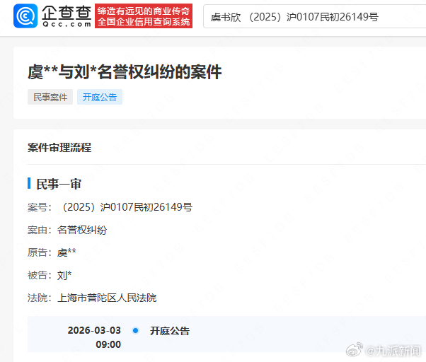 【#虞书欣起诉名誉权纠纷案将开庭#】#虞书欣新增一起名誉权纠纷案# 企查查APP显示,近日,法院公开虞书欣起诉刘某名誉权纠纷案件信息。据悉,该案计划将于3月3日,由上海市普陀区人民法院审理。