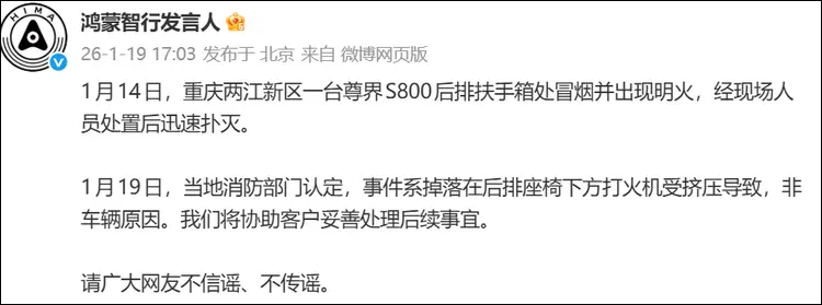 声明指出,1月14日重庆两江新区一台尊界S800后排扶手箱处冒烟并出现明火,经现场人员迅速处置后扑灭。当地消防部门于1月19日出具的认定显示,事件系“掉落在后排座椅下方的打火机受挤压导致”,排除了车辆本身问题。