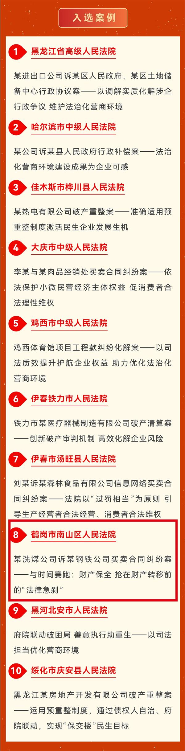 近日,黑龙江省委政法委印发《关于政法机关助力优化营商环境典型案例评选情况的通报》,公布了30件具有示范意义和推广价值的典型案例,其中南山区人民法院报送的《某洗煤公司诉某钢铁公司买卖合同纠纷案——与时间赛跑,财产保全抢在财产转移前的“法律急刹”》案例入选。