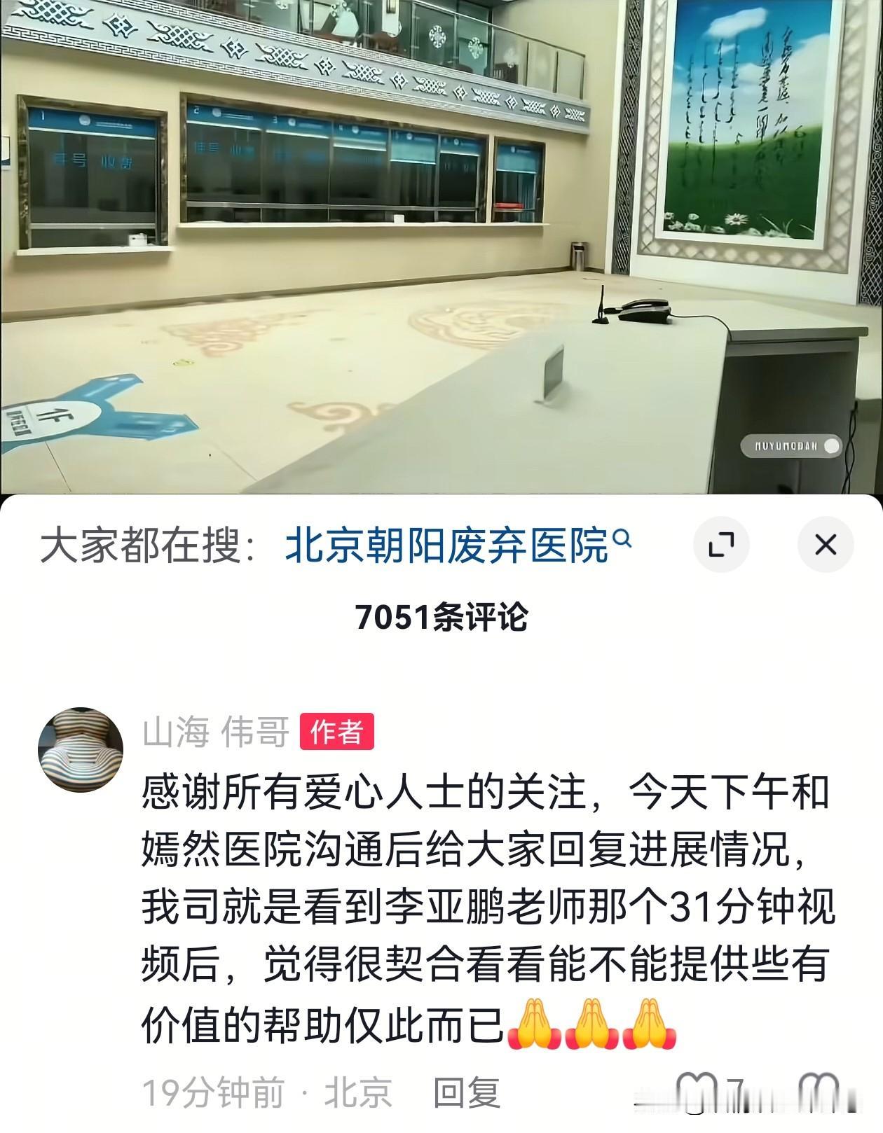 这是不是冥冥之中自有安排?同样位于北京朝阳区的“三发资产管理有限公司”可能是嫣然儿童医院最佳的迁址地。 抖音博主“山海 伟哥”2025年5月发布了一个公司整体招租的视频,是一个九成新的二级医院,有床位130张。公司位于朝阳区。 视频发布后,一直没有再更新,直到李亚鹏嫣然儿童医院欠租事件爆发,这个博主19日再次更新视频,希望联系李亚鹏推荐一下,愿意拿出部分面积免费给医院使用。 从视频里看得出,这个场地较大,也比较新,可以算是能“拎包入住”了。要是真能成,能节约不少时间和装修成本。 目前博主已经和嫣然天使医院方取得联系,约好周三看场地。看到这个消息,真的有些激动了。谁能想到,去年抖音上一条无人问津的医院招租视频,会在李亚鹏与嫣然儿童医院深陷欠租困境时,突然出现带来一线希望。 我想,世间所有的恰逢其时,大抵都是善意与缘分的双向奔赴。我们期待着周三的会面能传来好消息! 嫣然儿童医院 李亚鹏