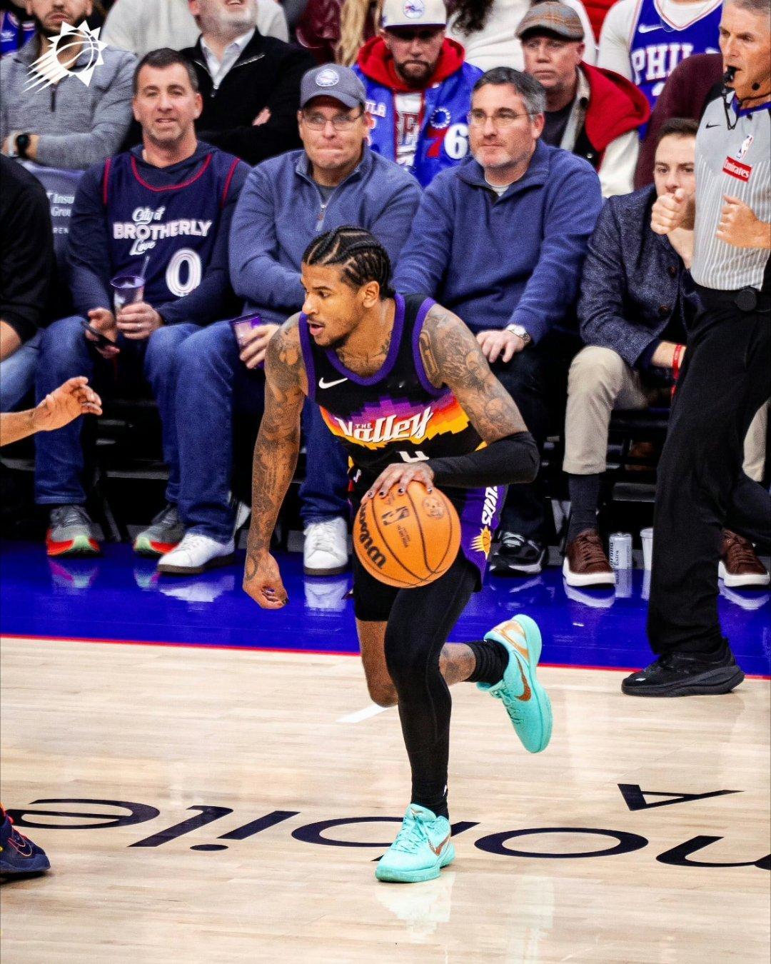 杰伦-格林复出并得分了!今天,太阳队前往费城挑战76人队,因腿筋拉伤缺席33