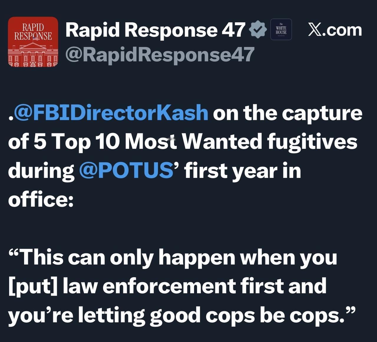 美国联邦调查局FBI局长帕特尔在特朗普上任第一年抓获了 5 名十大通缉犯: “