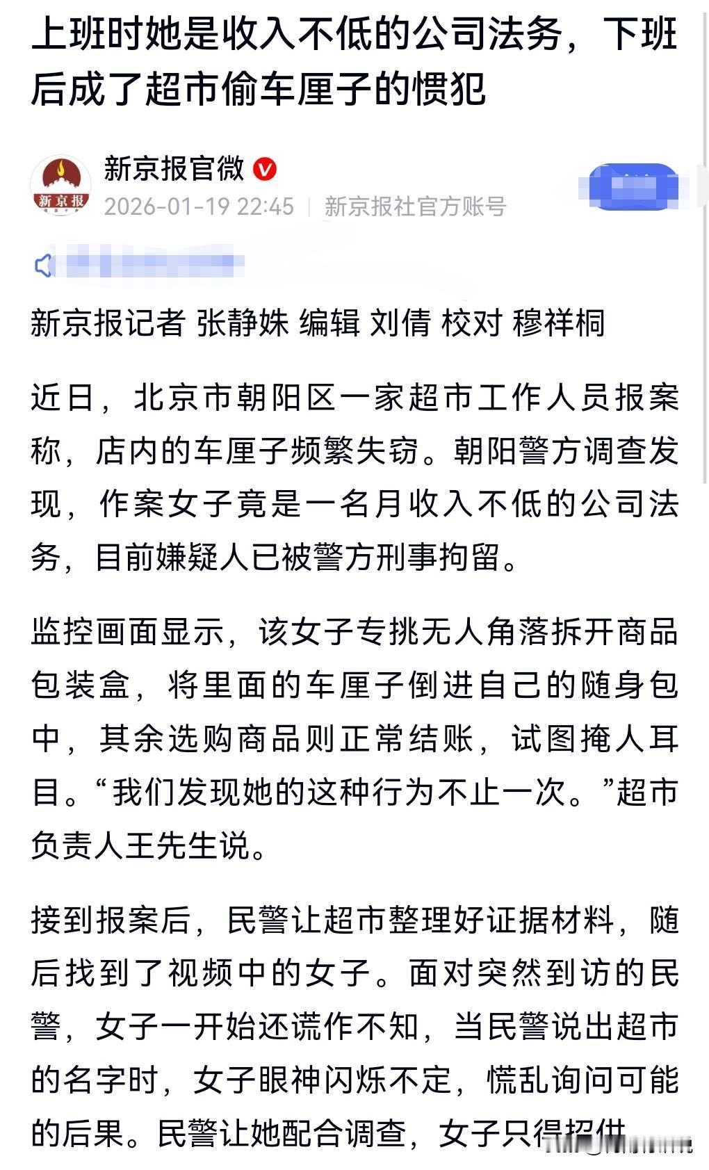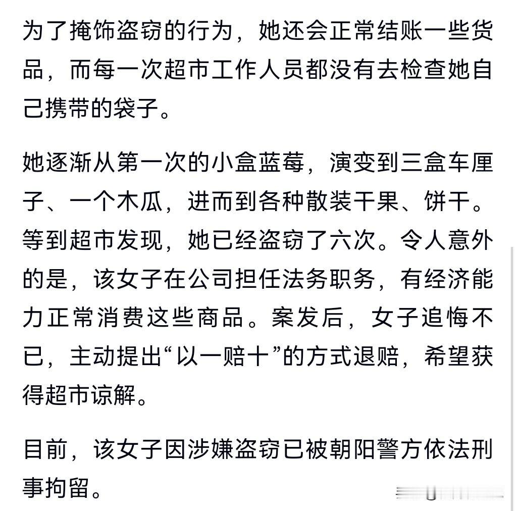 这真的是知法犯法啊,就这样的人,还是公司的法务。 近日一个超市工作人员报案,店内的车厘子经常被盗。 作案的竟然是一个收入不低的公司法务。 刚开始的时候发现有商品忘给钱。 收银员没有发现。 之后胆子就大了起来,偷了不少的商品。 但最终被抓了。上班是法务 下班是偷车厘子惯犯
