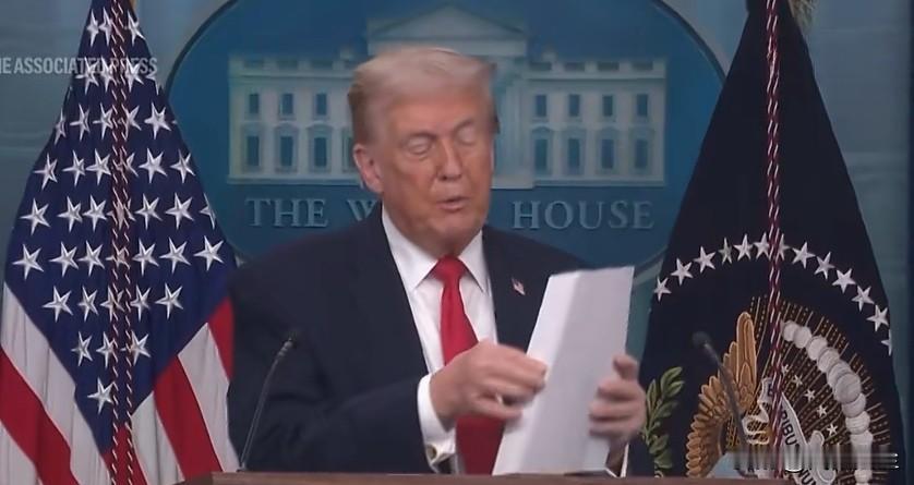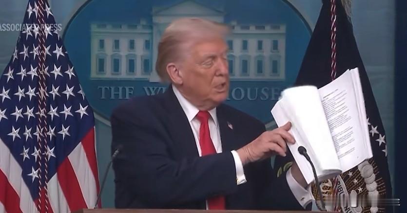 特朗普在新闻发布会上将一沓厚厚的“成就”直接扔在了地上。他自称都是上任一年来所做的“大事”,美国现在是炙手可热的国家,然后“bia ji”就给扔地上了。