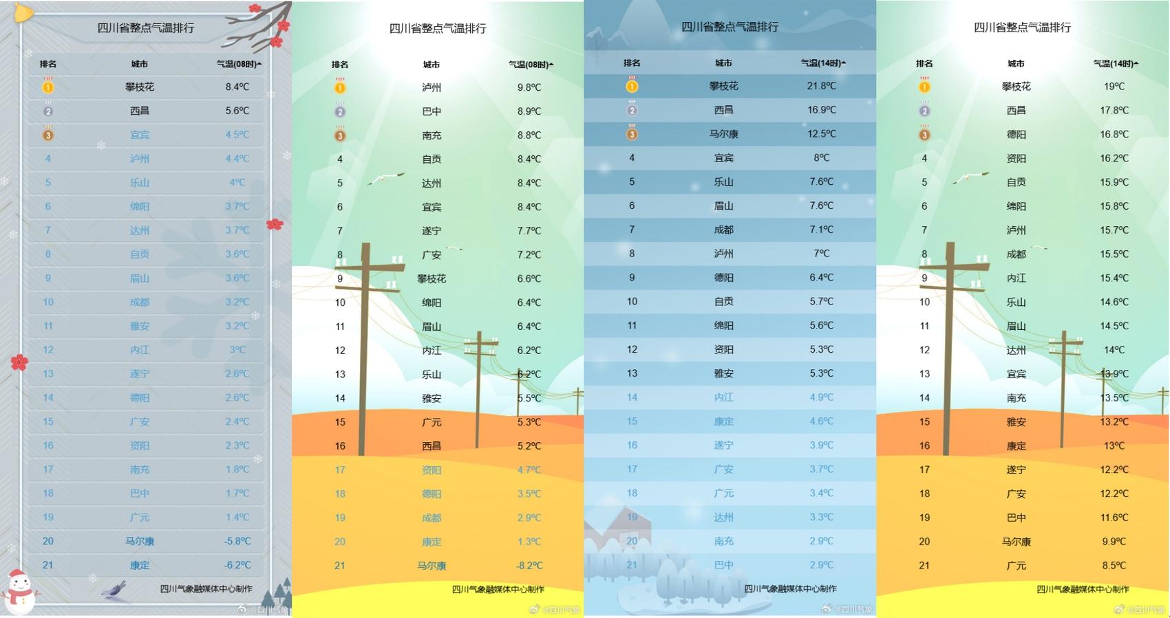 图为四川省各城市1月21日8时、1月18日8时、1月20日14时、1月18日14时实况气温。