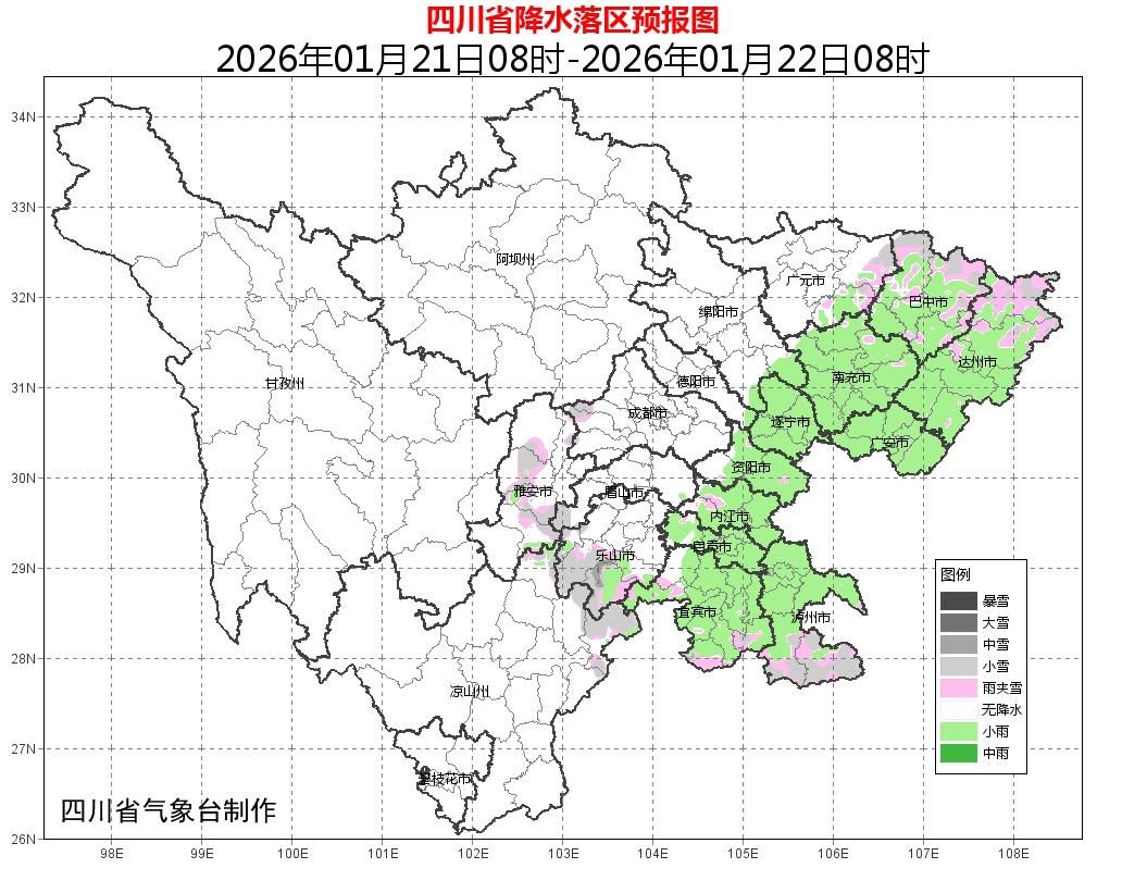 四川省气象台早间发布最新天气预报:21日白天到夜间盆地大部阴天,东部南部有小雨或雨夹雪,盆周区域部分地方有雨夹雪或小雪,气温较低;凉山州东北部多云间阴有分散阵雪或阵雨,川西高原和攀西地区的其余地方晴间多云。