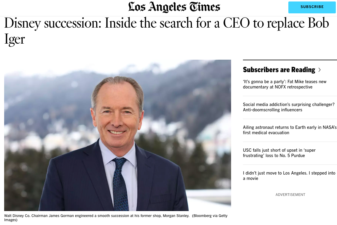 TNABO 根据《洛杉矶时报》报道,迪士尼CEO接班人预计下个月公布,目前内部有四位候选人角逐CEO职位,分别是:乔什·达马罗(主题乐园)达纳·沃尔登(电视流媒)艾伦·伯格曼(电影)吉米·皮塔罗(ESPN)许多人认为,负责主题乐园的乔什·达马罗最有可能接棒。华尔街看好这位在迪士尼拥有27年工作经验、主导了为期五年、耗资600亿美元的乐园及邮轮扩张计划的魅力型高管。然而由于他缺乏电影方面的经验,娱乐圈的内部人士认为,最高电视与流媒体高管达纳·沃尔登也存在接班可能,有望成为这家102年历史公司首位女性CEO。由于四位候选人均负责公司核心业务,这增加了若干候选人落选后可能离职的风险。六年前包正博当选CEO时,迪士尼流媒体战略负责人凯文·迈耶就因此离开。且眼下传媒行业充满挑战,要应对传统电视频道的衰落、向流媒的转型、人工智能发展、美国充满不确定的经济跟尖锐的政治环境,使得接班计划压力更大。迪士尼CEO接班长期以来一直是公司的“阿喀琉斯之踵”。当年迈克尔·艾斯纳因与股东及皮克斯联合创始人史蒂夫·乔布斯闹矛盾,导致董事会危机而延迟交权。艾格在2005年上任后迅速采取举措,收购皮克斯、漫威娱乐及《星球大战》幕后工作室卢卡斯影业,稳固公司的创意引擎。为了确保这次交接班顺利,迪士尼已经特意找到一名外部人士——前摩根士丹利掌门人詹姆斯·P·戈尔曼。他在摩根士丹利的14年高管生涯中成功稳定并振兴这家华尔街银行,在2024年12月退休时实现了一次无缝的权力交接。