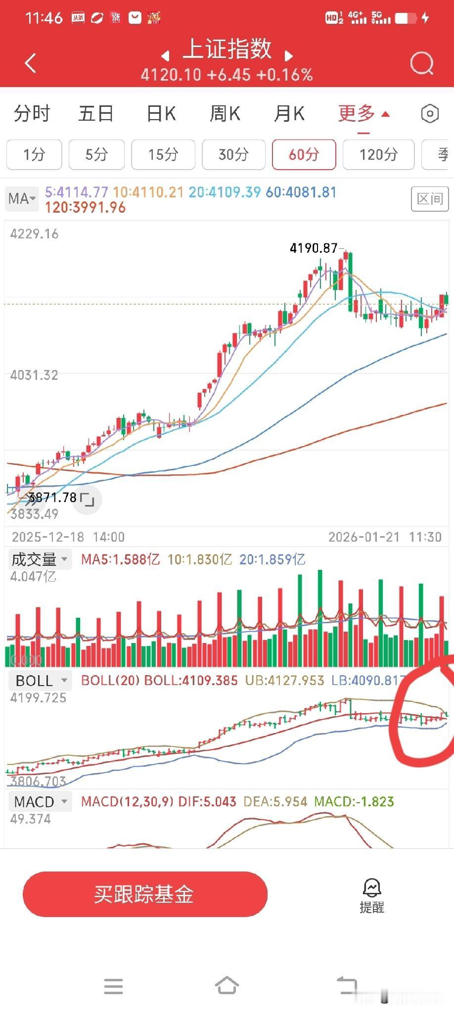 1月21日午评。A股今天的市场强出美股太多太多,上午不负众望果然反弹,唯一遗憾的是量能萎缩了2000亿(图1)。但也有可喜之处,即今天上午主力终于由卖出状态转为买入状态,至少从行情上讲,不管是普通机构也好、基金也好、散户也好大家一致希望市场重燃生机。 那么,管理层的降温是否就到此为止了呢?现在做这个判断为时尚早。因为从量能上看,大家都有保留,缩量上涨的行情中,隐约透露出大家对后市走势的担忧。因此,当下行情,暂时还只能作反弹看待。事实也证明,今天沪指到达4128点的压力位后马上有部分资金在打退堂鼓。本轮调整是否要走一波ABC的完整结构浪现在还不好下定论。 预计下午,指数还会在一个15分钟级别的反弹结构中走震荡波动走势。而60分钟级别的布林线已经明显走出一个收口喇叭线(图2),大盘是向上变盘还是向下复变盘今下午或明天上午就有一个说法。大家控制好仓位耐心等待即可。 个人观点,不构成投资依据,不喜勿喷。祝大家下午好运。