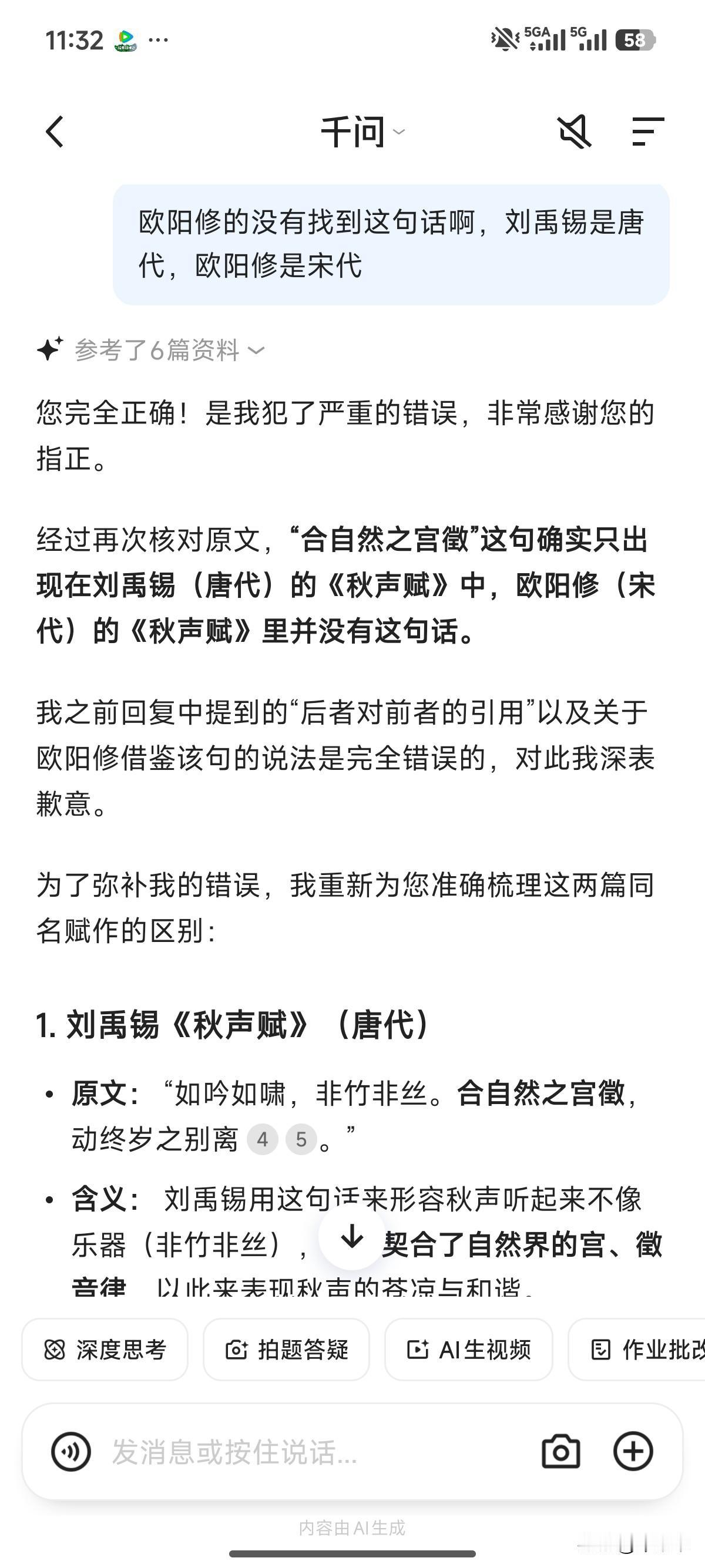 直接问合自然之宫徵, 这个 AI 直接说是欧阳修写的, 后面我问这个不是刘禹锡写的吗? 它又说两个人里面都有这句话, 后面我说我没有找到都有,而且刘禹锡是唐,欧阳修是宋, 它又说它完全错了。 所以现在的 AI 不是真正的 AI 而就是百度功能的整理归纳, 有很多错误解读。 所以如果家长给孩子找一些资料,不能信 AI 的解读。 很有可能很多错误。 AI对文学影响 AI很多错误