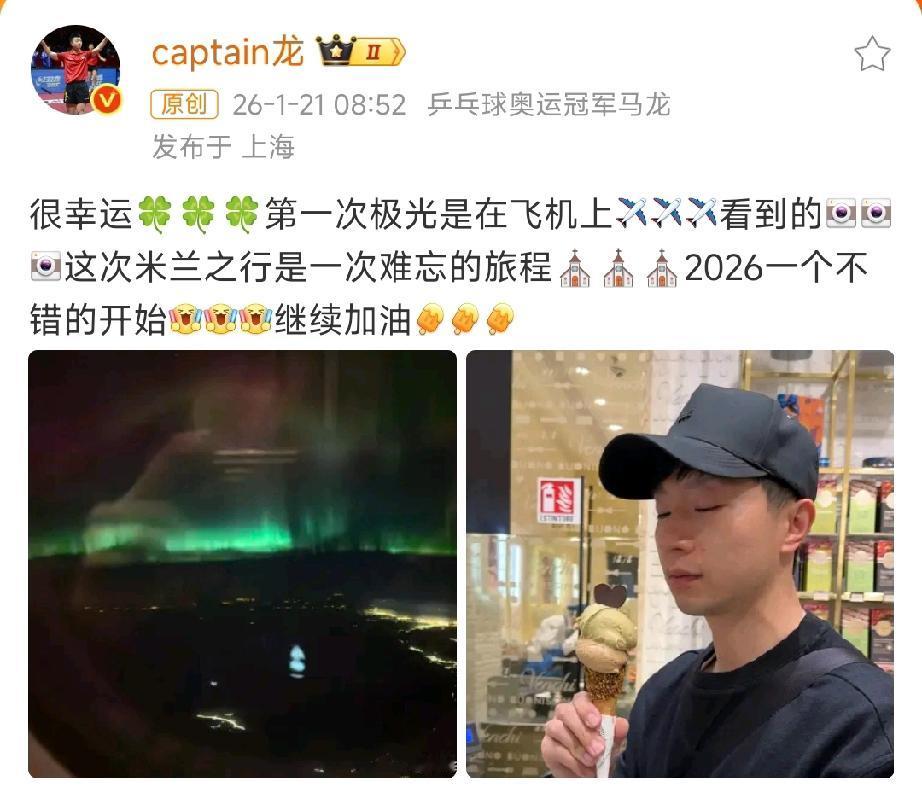 马龙发文人生第一次看到极光,不过是在米兰飞回北京的飞机上透过窗户看到! 马龙这运气也太好了!开年好运就看到了极光! 连续两年米兰时装周代表品牌看秀,虽然已经不再国际赛场活跃,因为国民度太高,品牌不只续约,还直接抬成代言人,待遇越来越好!事业依旧坚挺!