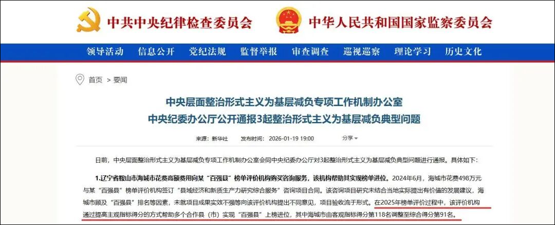 通报提到,2024年6月,海城市花费498万元与某“百强县”榜单评价机构签订“县域经济和新质生产力研究综合服务”咨询项目合同。该咨询项目研究未结合当地实际提出有价值的发展建议,海城市顾及“百强县”排名等因素,未就项目成果实效不强等向该评价机构提出不同意见,项目验收流于形式。在2025年榜单评价过程中,该评价机构通过提高主观指标得分的方式帮助多个合作县(市)实现“百强县”上榜进位,其中海城市由客观指标得分第118名调整至综合得分第91名。